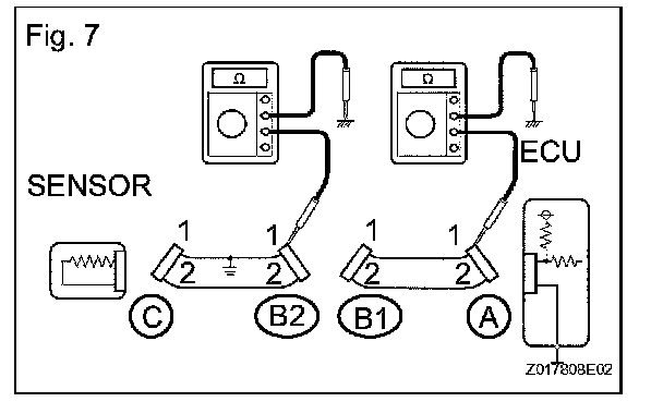 HINT: Measure the resistance while lightly shaking the wire harness vertically and horizontally. If your results match the examples, an open circuit exists between terminal 1 of connector A and terminal 1 of connector C.