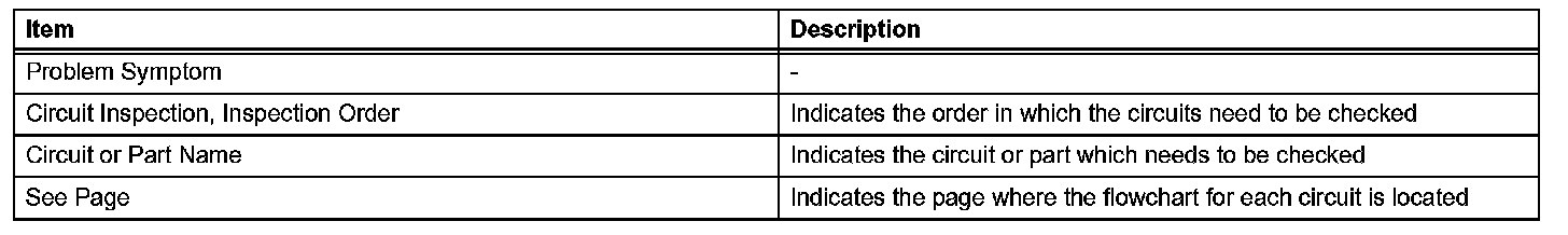 PROBLEM SYMPTOMS TABLEWhen a "Normal" code is output during a DTC check but the problem still occurs, use the Problem Symptoms Table. The suspected areas (circuits or parts) for each problem symptoms are in the table. The suspected areas are listed in order of probability. A description of each of the chart's columns is shown in the table.