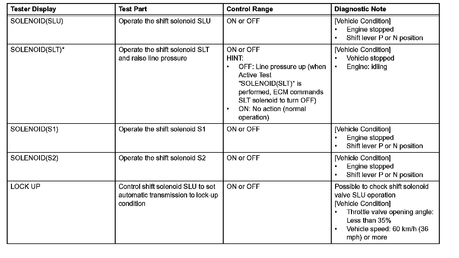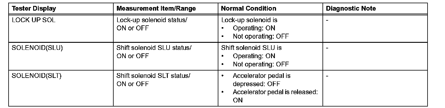 *: "SOLENOID(SLT)" in the ACTIVE TEST is performed to check the line pressure changes by connecting SST to the automatic transmission, which is used in the HYDRAULIC TEST as well. Hydraulic Test