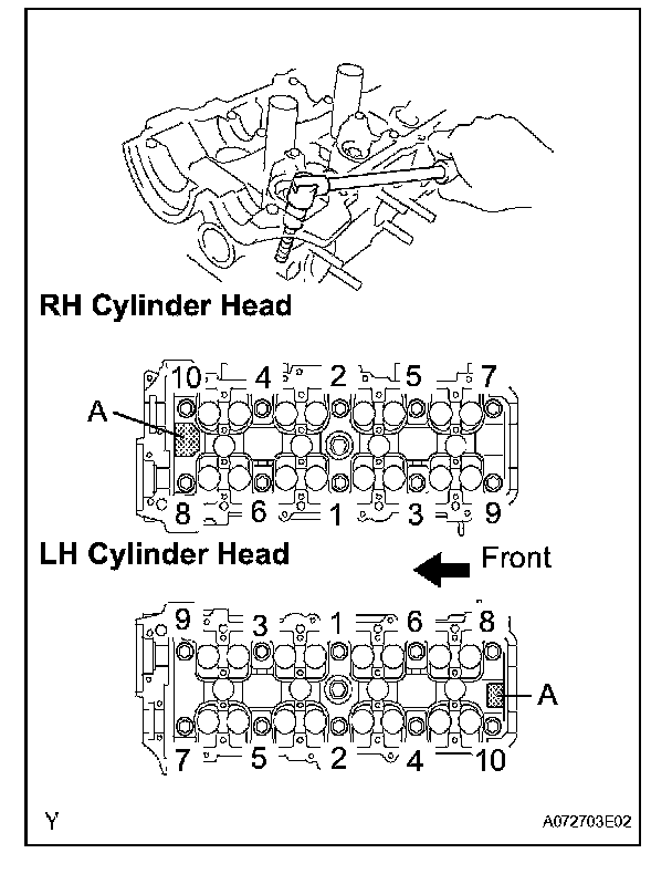 Install and uniformly tighten the 10 cylinder head bolts on one side of the cylinder head in several steps in the order shown in the illustration, then do the other side in the same way (Procedure "A").