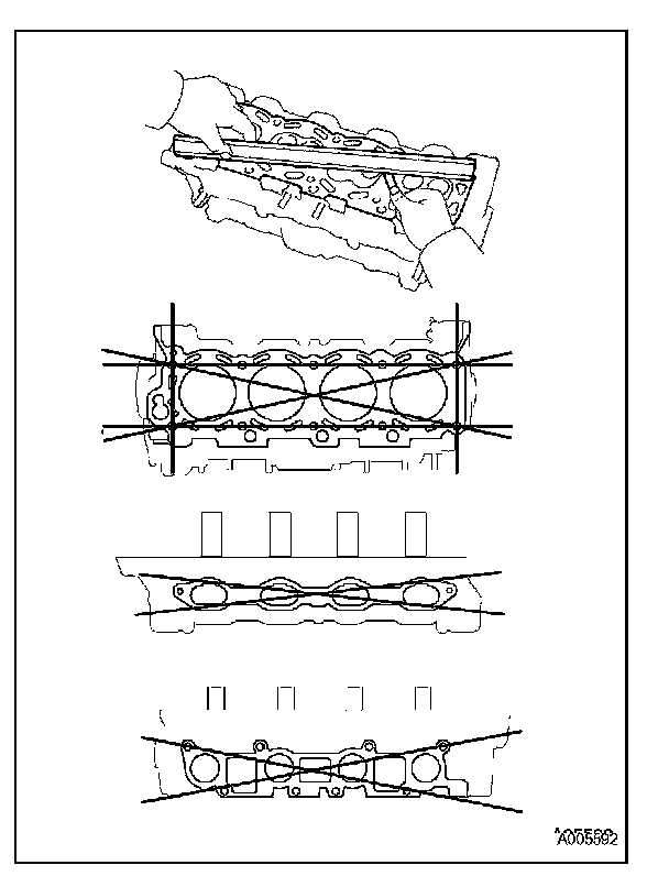 Using a precision straight edge and feeler gauge, measure the warpage of the contact surfaces of the cylinder block and the manifolds.