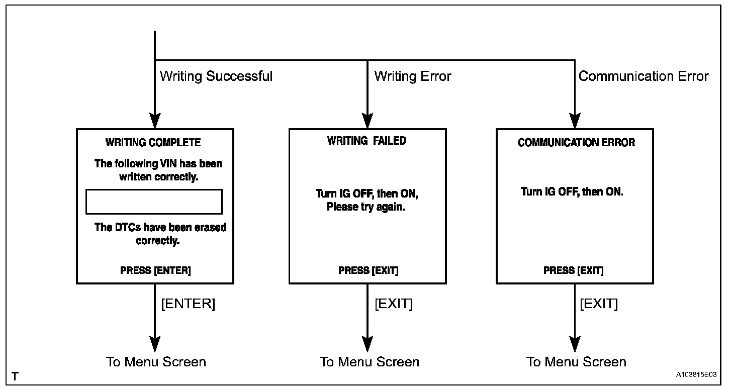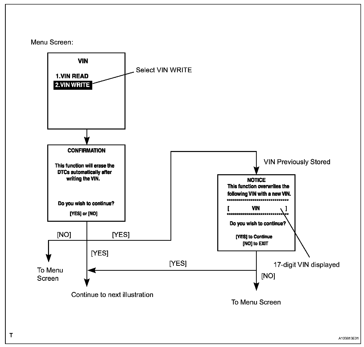 c. Write VIN: Explains the VIN writing process in a flowchart. This process allows the VIN to be input into the ECM. If the ECM is changed, or the VIN and VIN do not match, the VIN can be registered, or overwritten in the ECM by following this procedure.