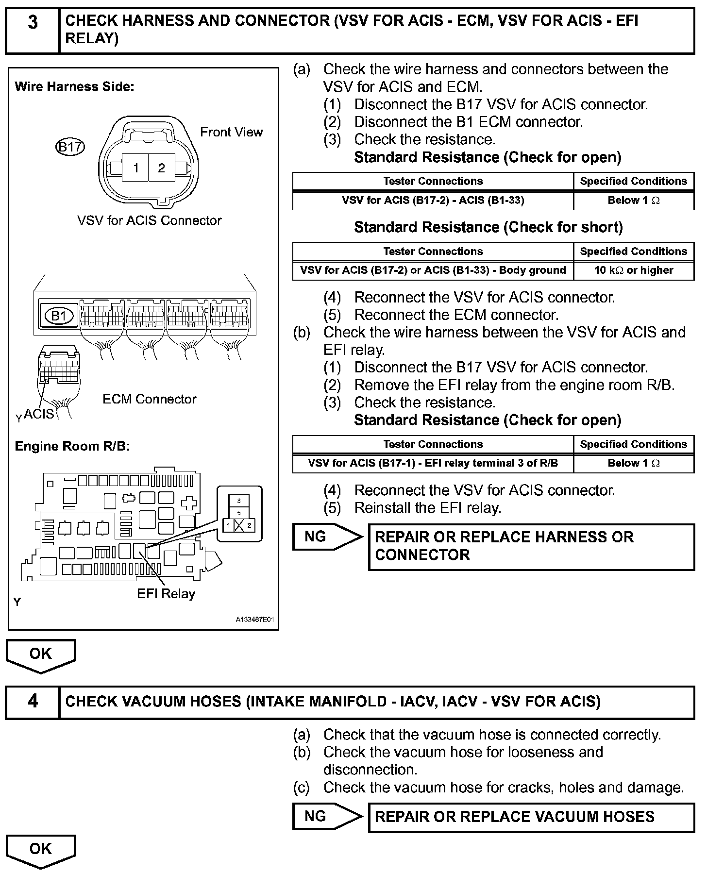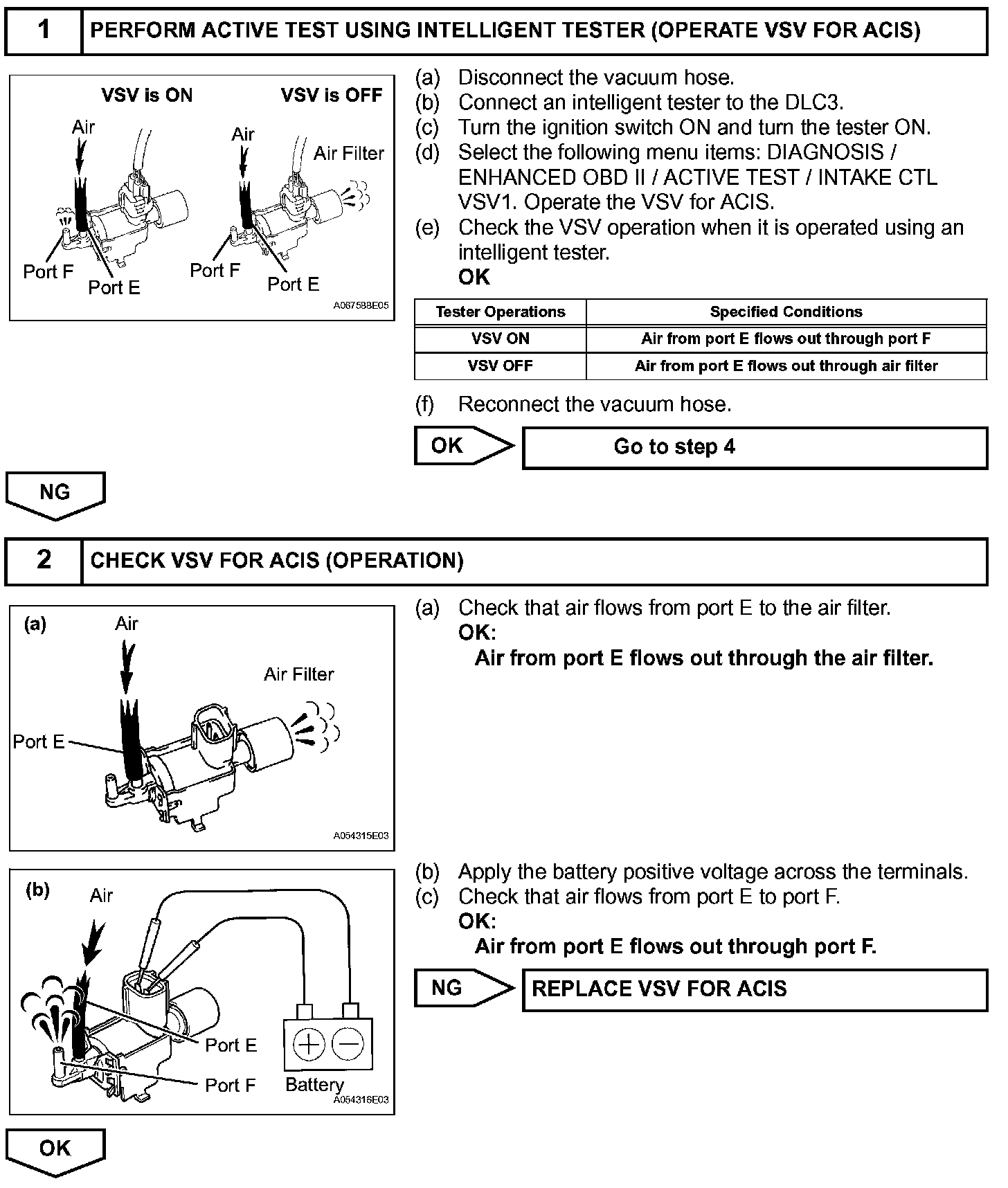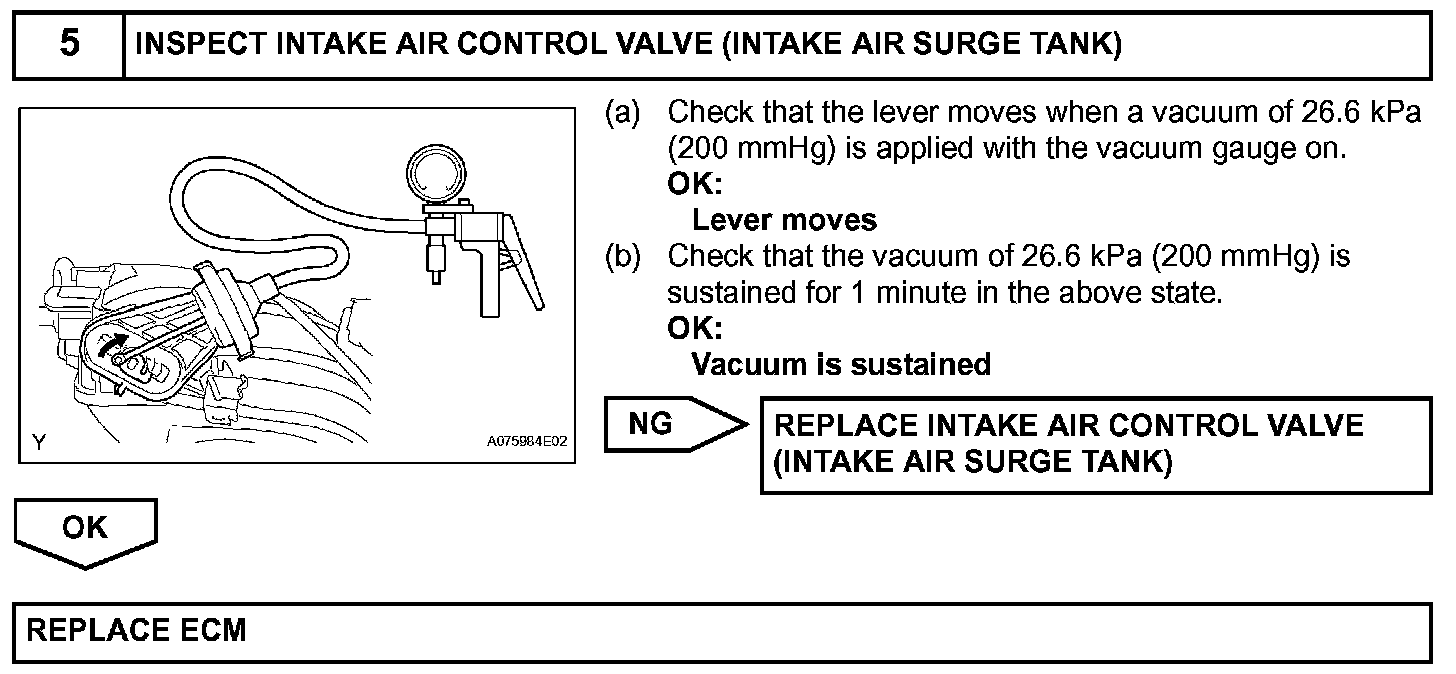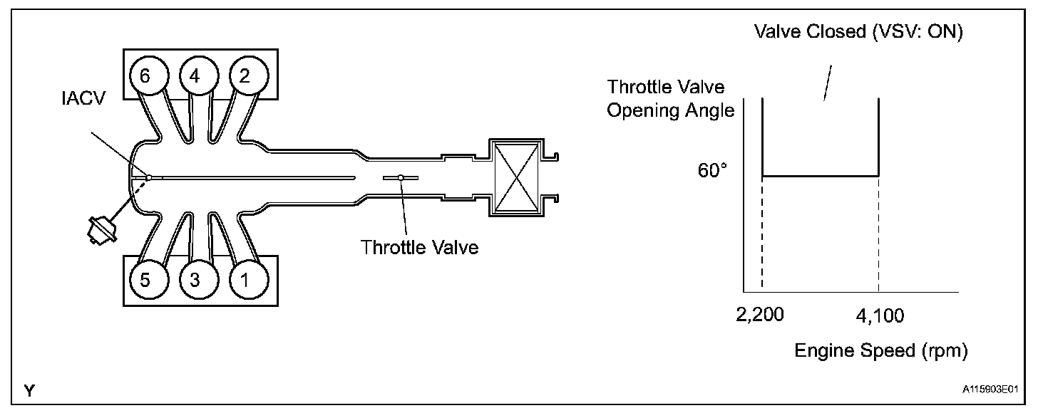 When the engine speed is between 2,200 rpm and 4,100 rpm and the throttle valve opening angle is 60° or more, the ECM supplies current to the VSV (ON status), to close the IACV. Under other conditions, the VSV is usually OFF and the IACV is open.