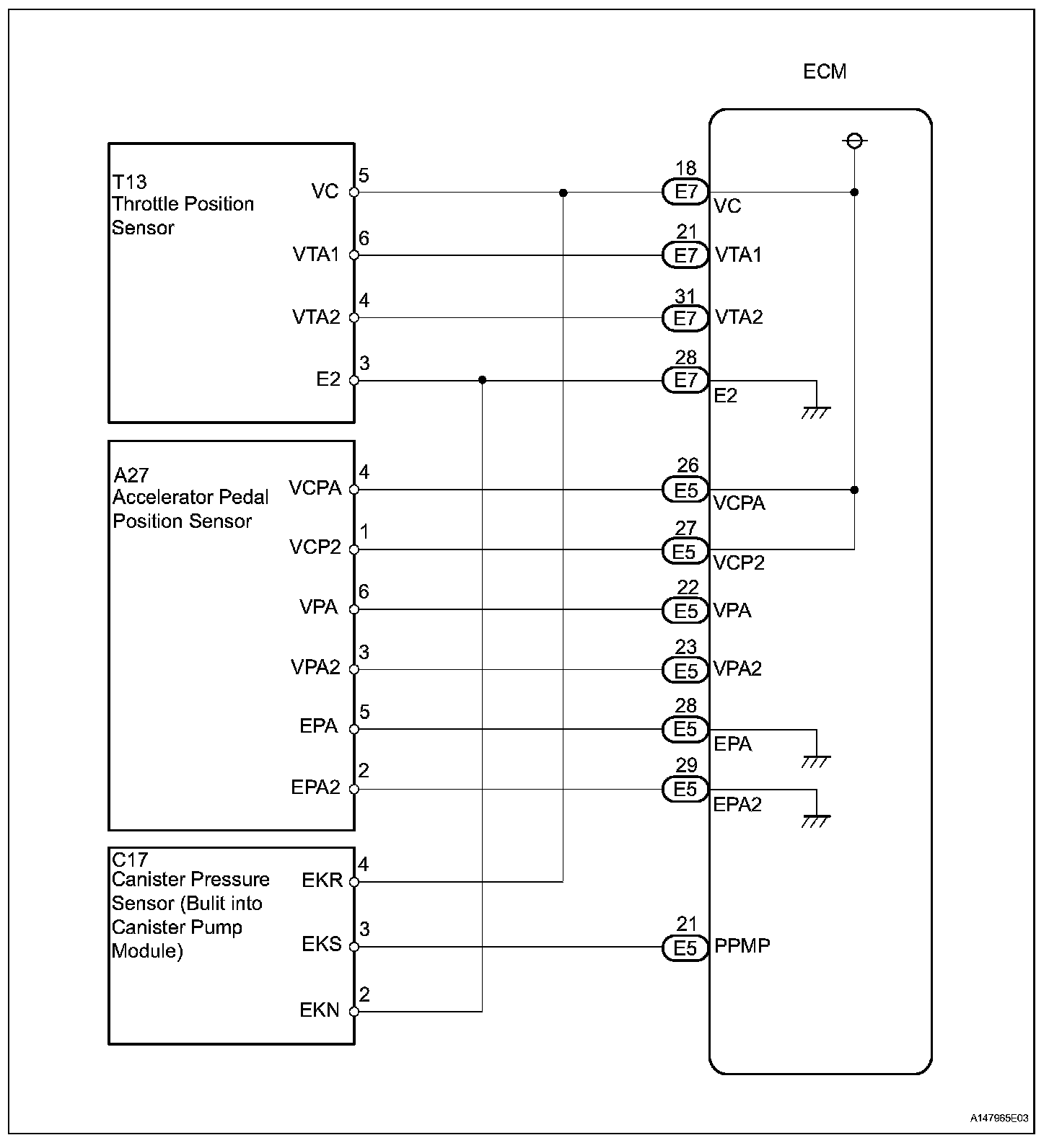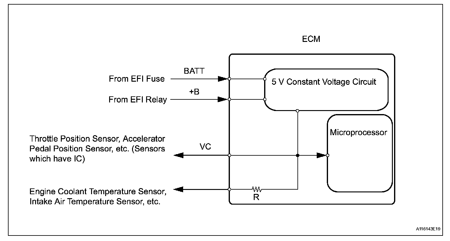 The ECM constantly generates 5 V power from the battery voltages supplied to the +B (BATT) terminal to operate the microprocessor. The ECM also provides this power to the sensors through the VC output circuit.