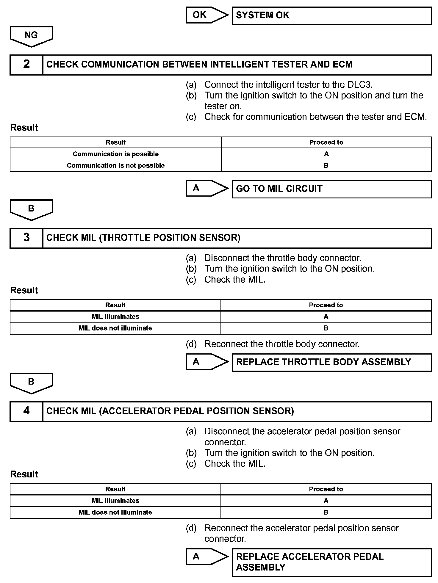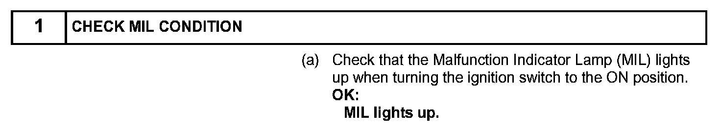 HINT: Under normal conditions, the MIL is illuminated for several seconds when the ignition switch is first turned to the ON position. The MIL goes off when the engine is started.