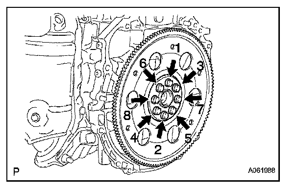 Install the front spacer, drive plate and rear spacer with the 8 bolts. Uniformly tighten the bolts in the sequence shown in the illustration.