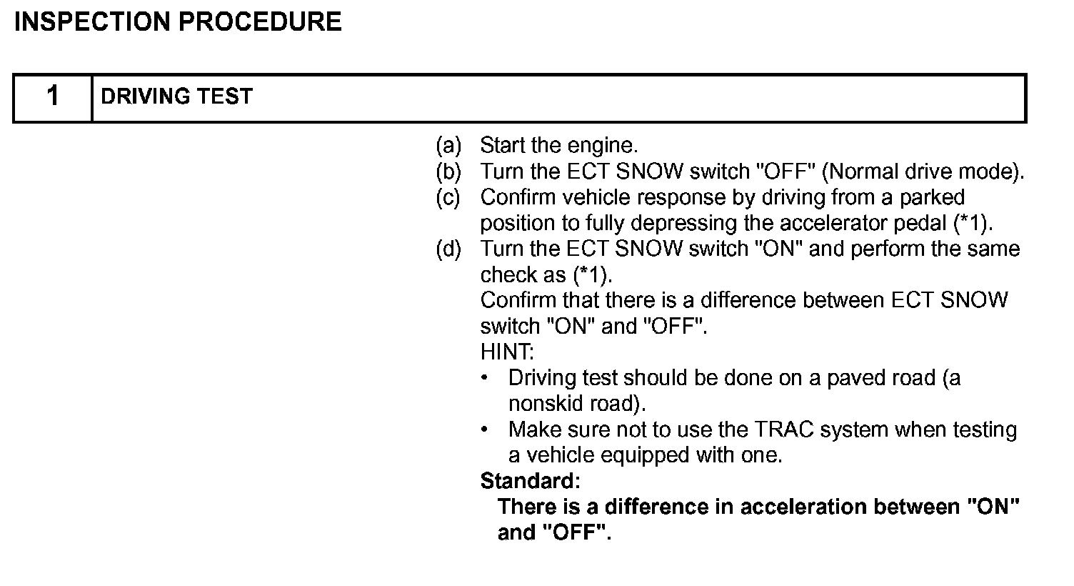 ECT SNOW is the system that operates the throttle motor to control engine output to reduce skidding of the driving wheels, guarantee takeoff acceleration, driving straightness and turning stability.