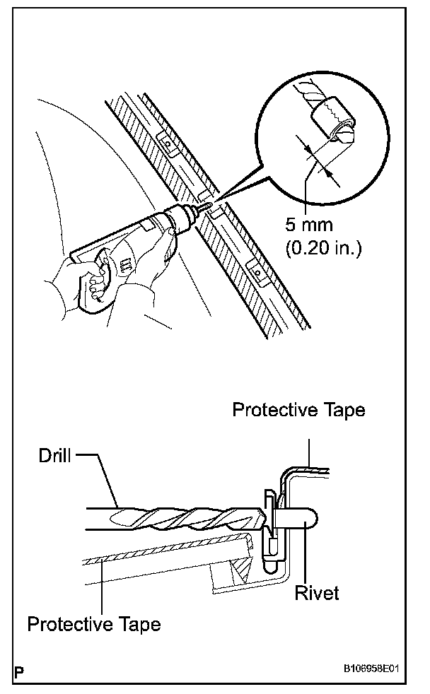 a. Using an air riveter or hand riveter with nose piece, strike rivets into the body panel to install the windshield outside moulding clip No.1 to the body panel.
