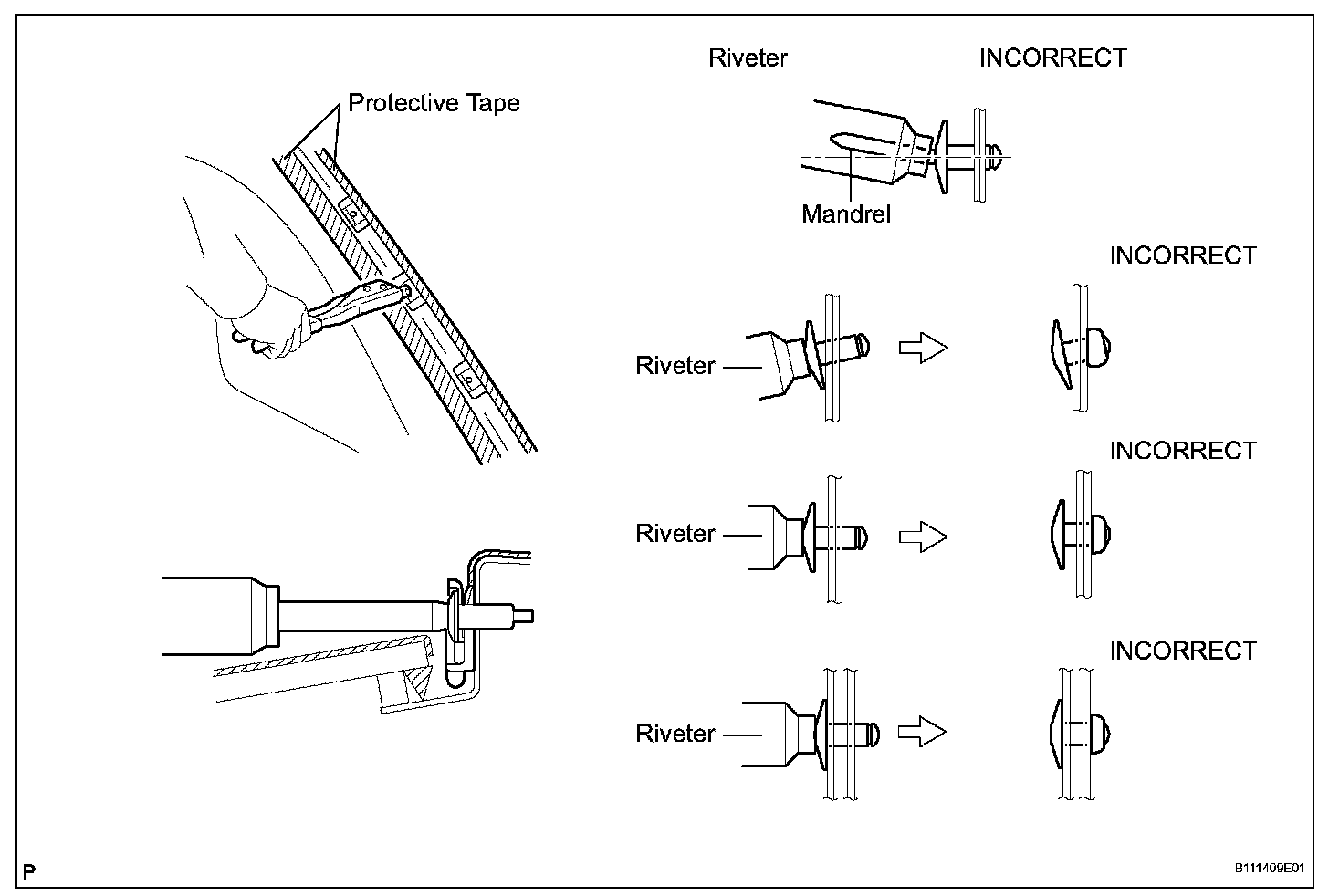 - Do not prize a riveter, because the riveter will be damaged and the mandrel will be bent.