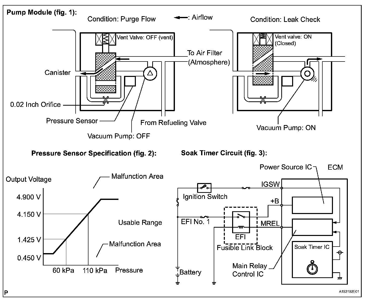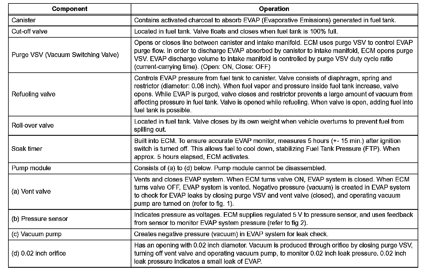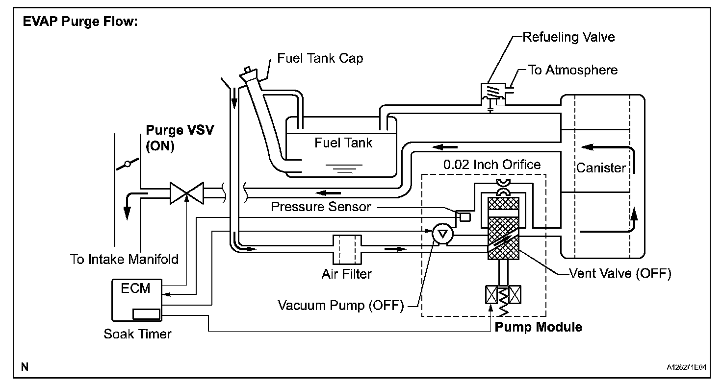 The electric vacuum pump creates negative pressure (vacuum) in the EVAP system, and the pressure is measured. Finally, the ECM monitors for leaks from the EVAP system and malfunctions in both the pump module and purge VSV, based on the EVAP pressure.