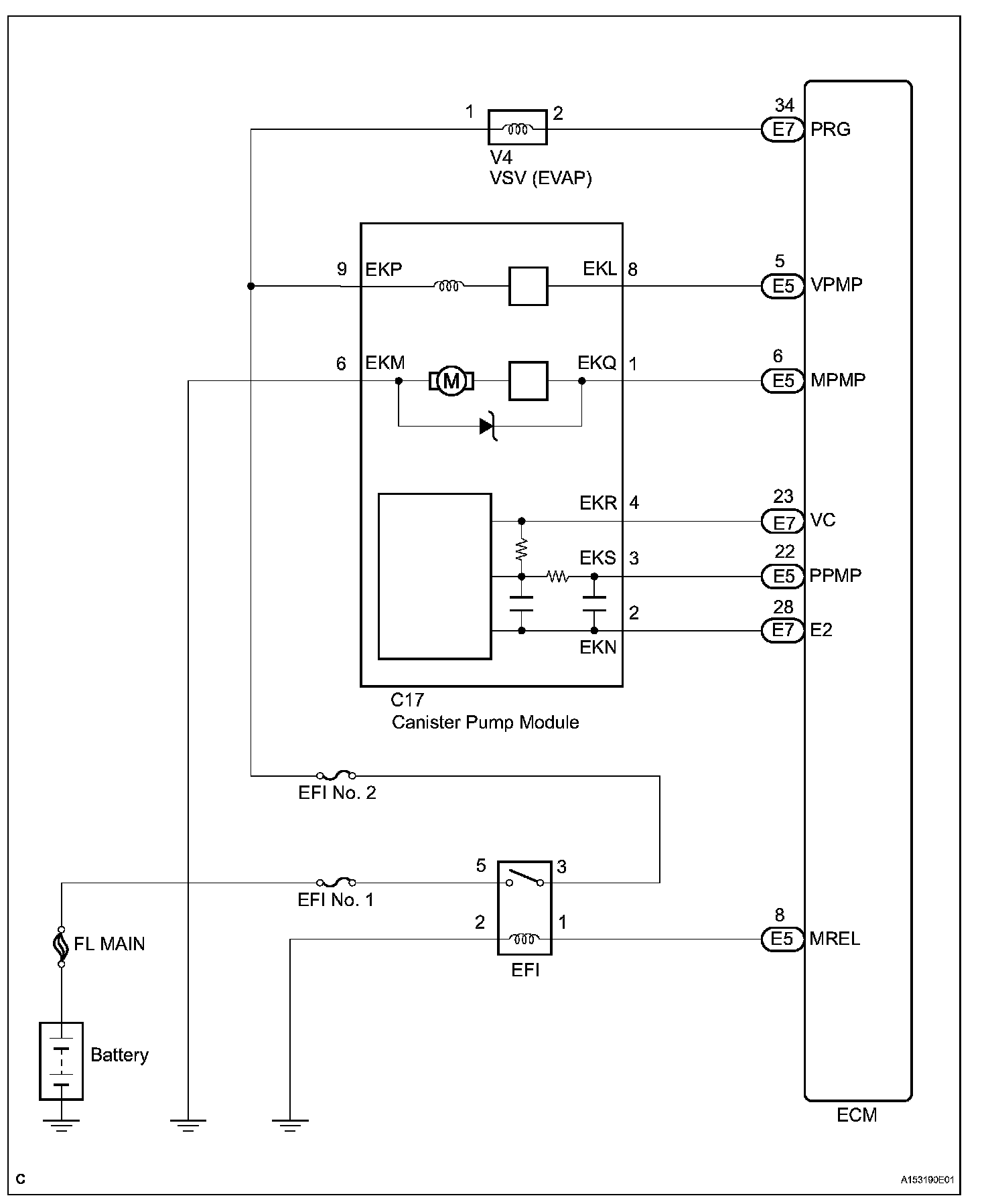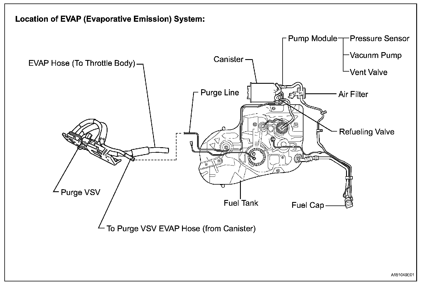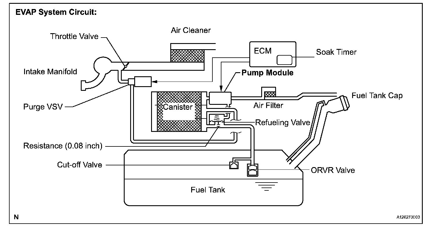 The electric vacuum pump creates negative pressure (vacuum) in the EVAP system, and the pressure is measured. Finally, the ECM monitors for leaks from the EVAP system and malfunctions in both the pump module and purge VSV, based on the EVAP pressure.