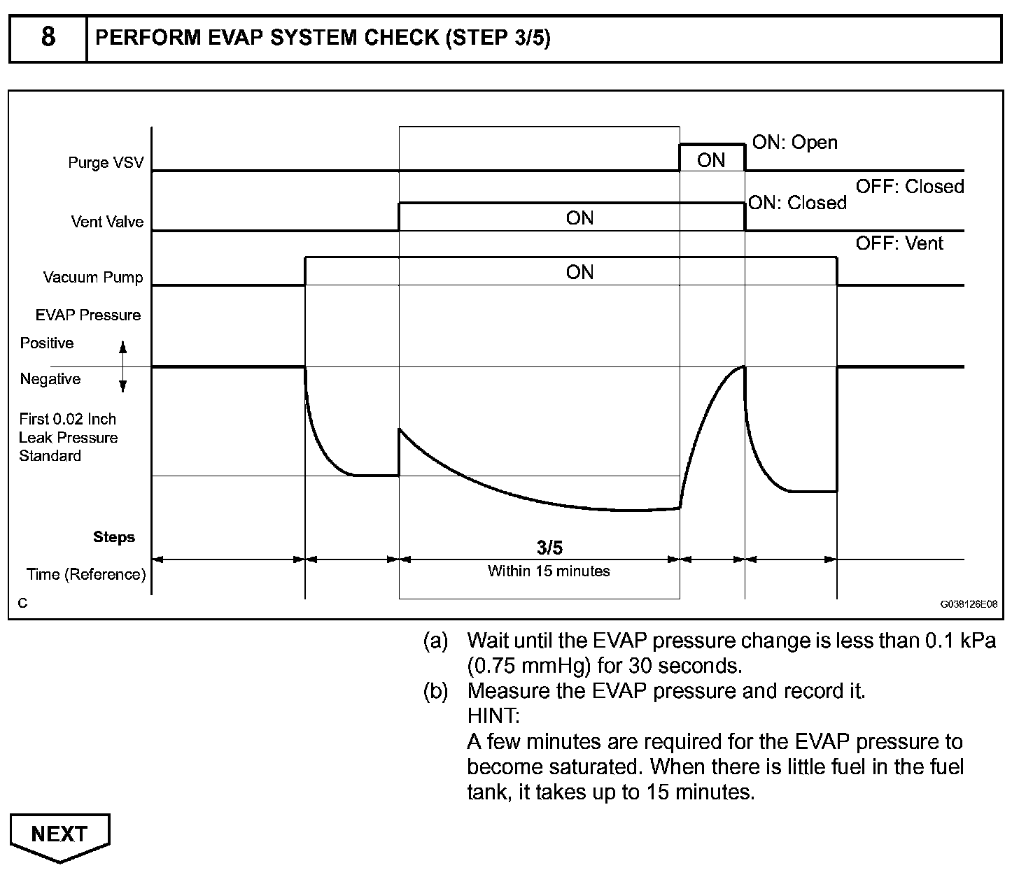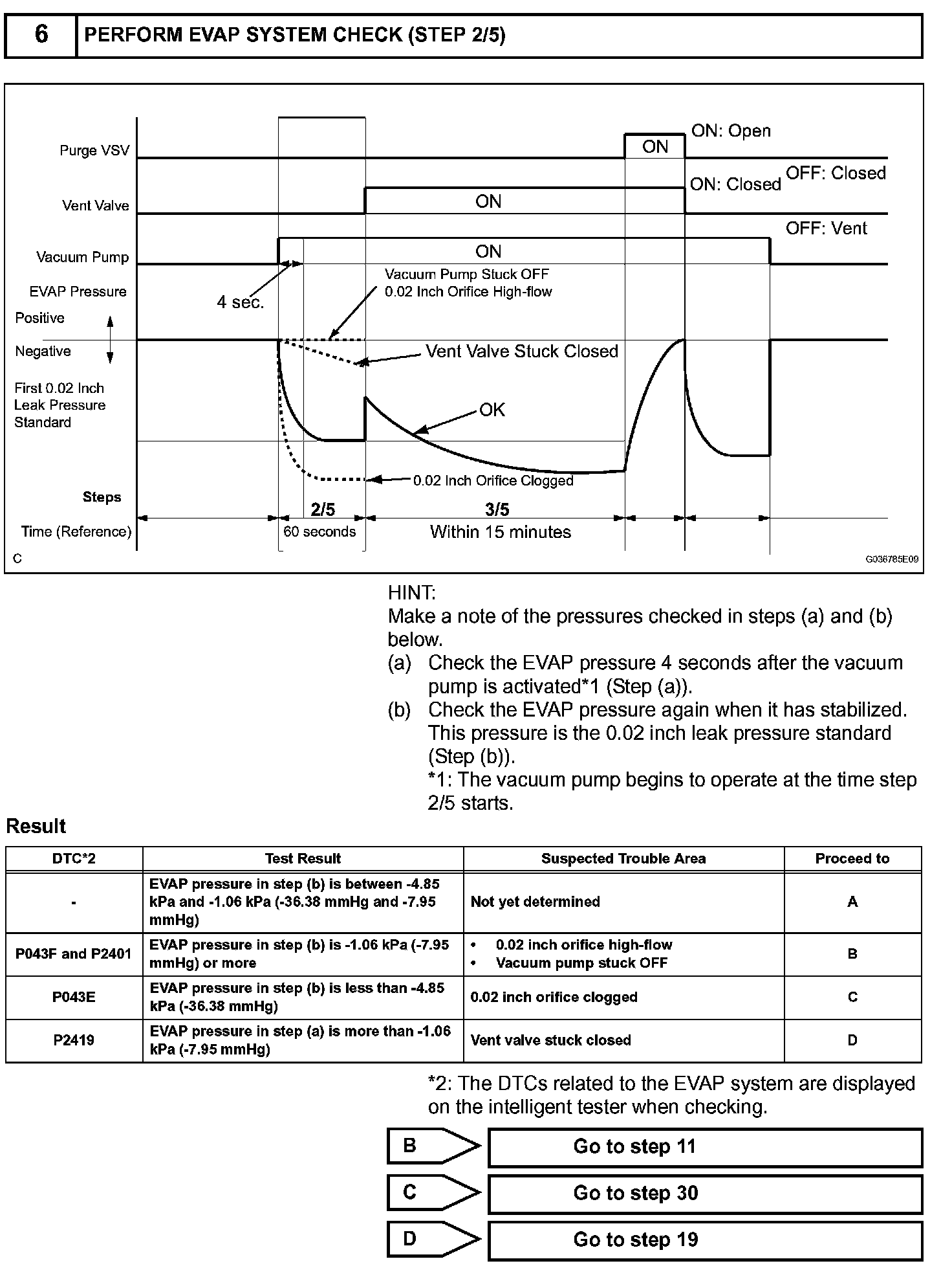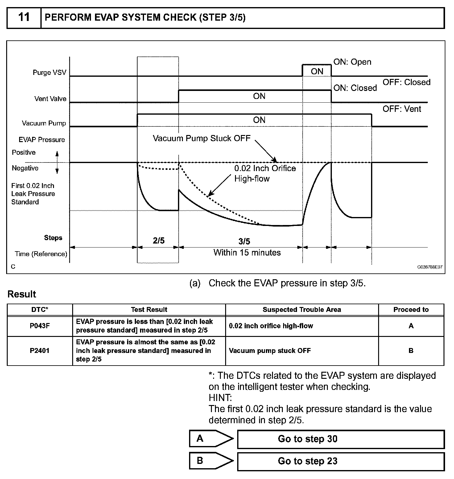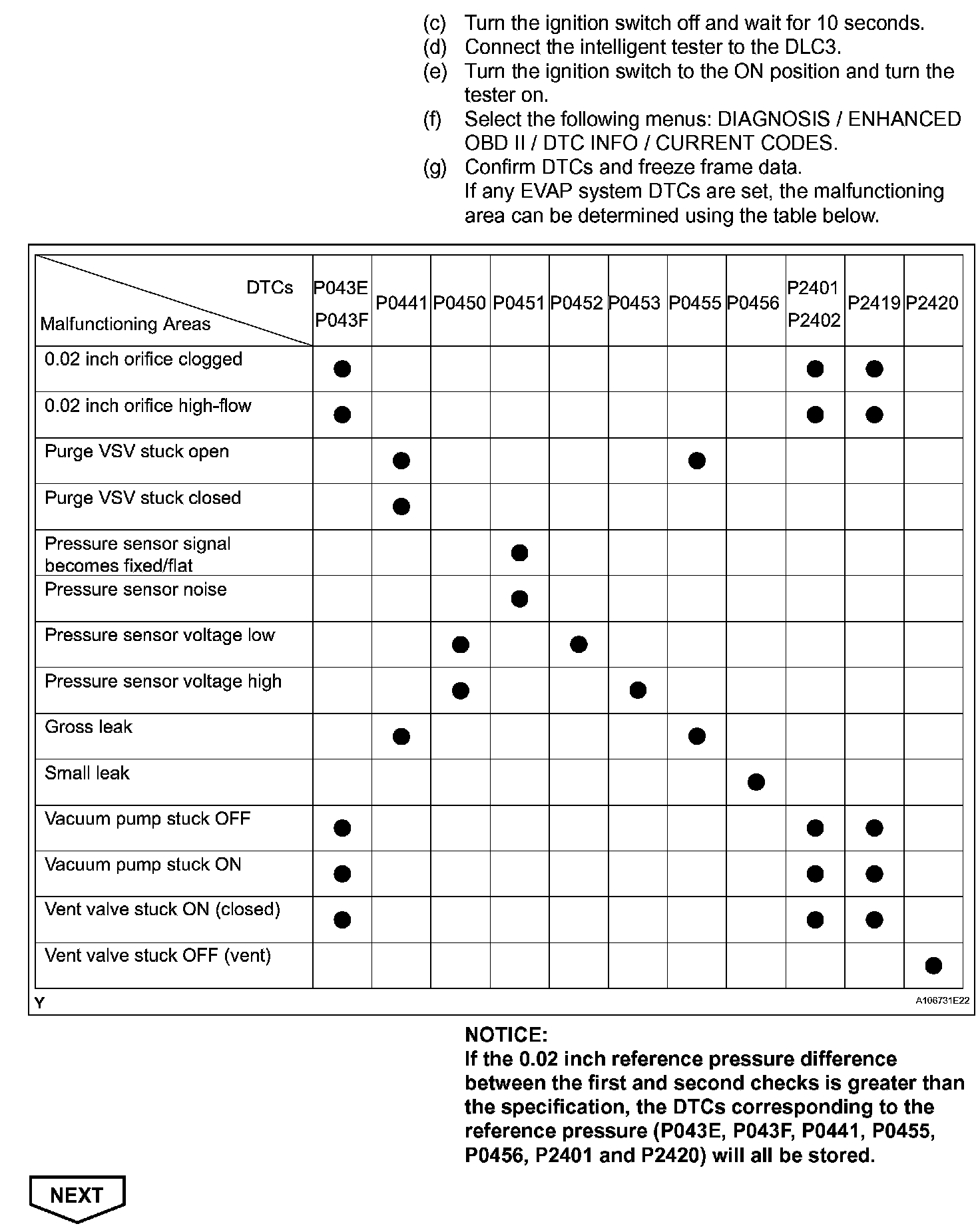 NOTE: If the 0.02 inch reference pressure difference between the first and second checks is greater than the specification, the DTCs corresponding to the reference pressure (P043E, P043F, P0441, P0455, P0456, P2401, P2420) will be all stored.