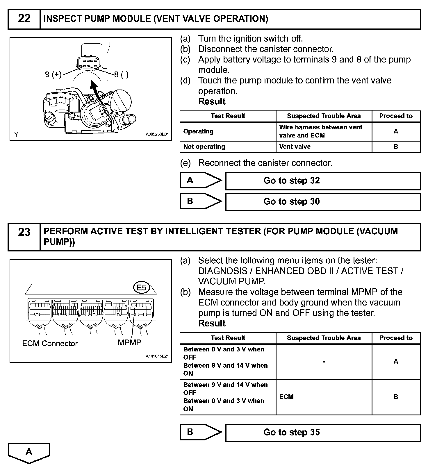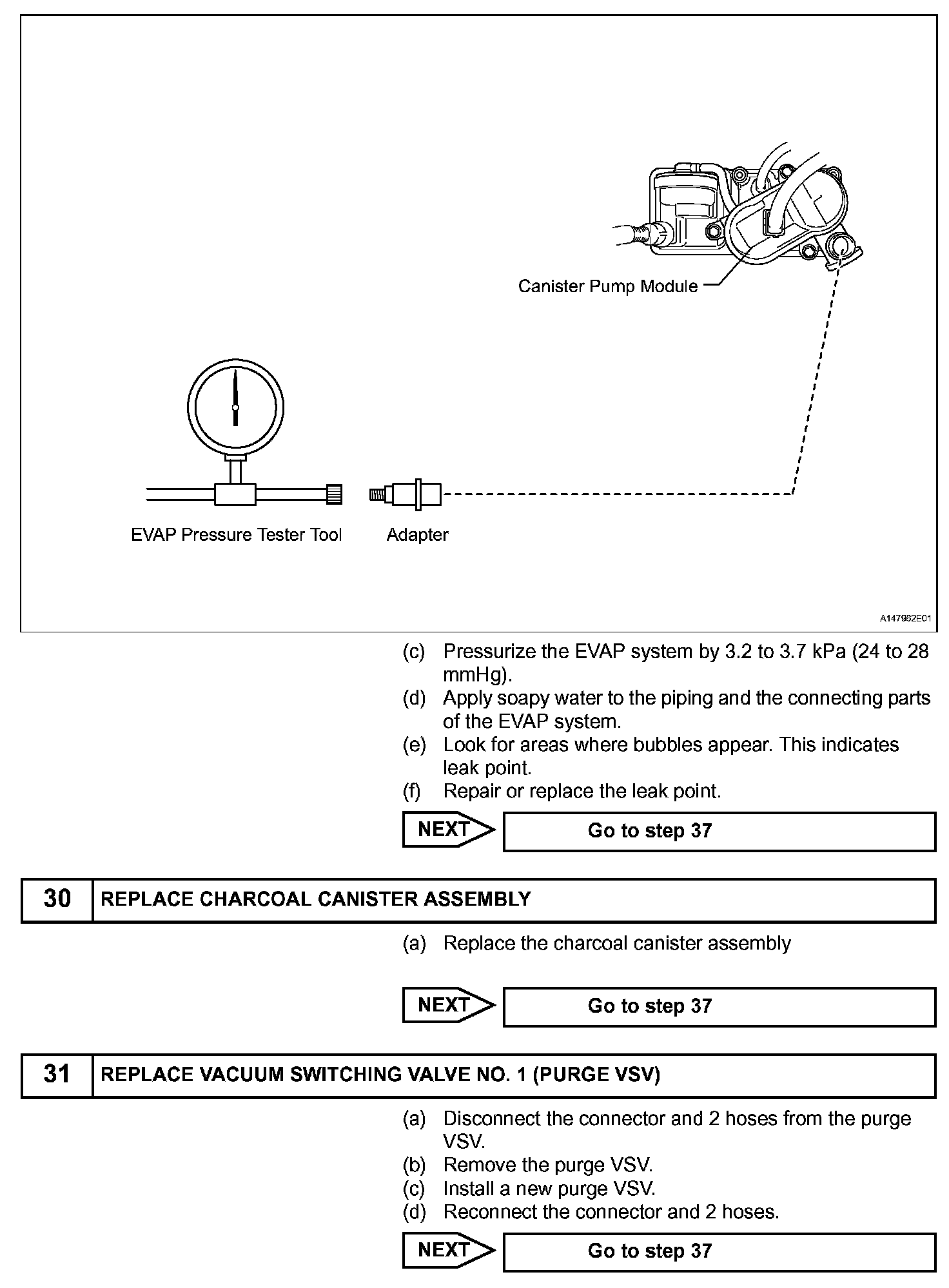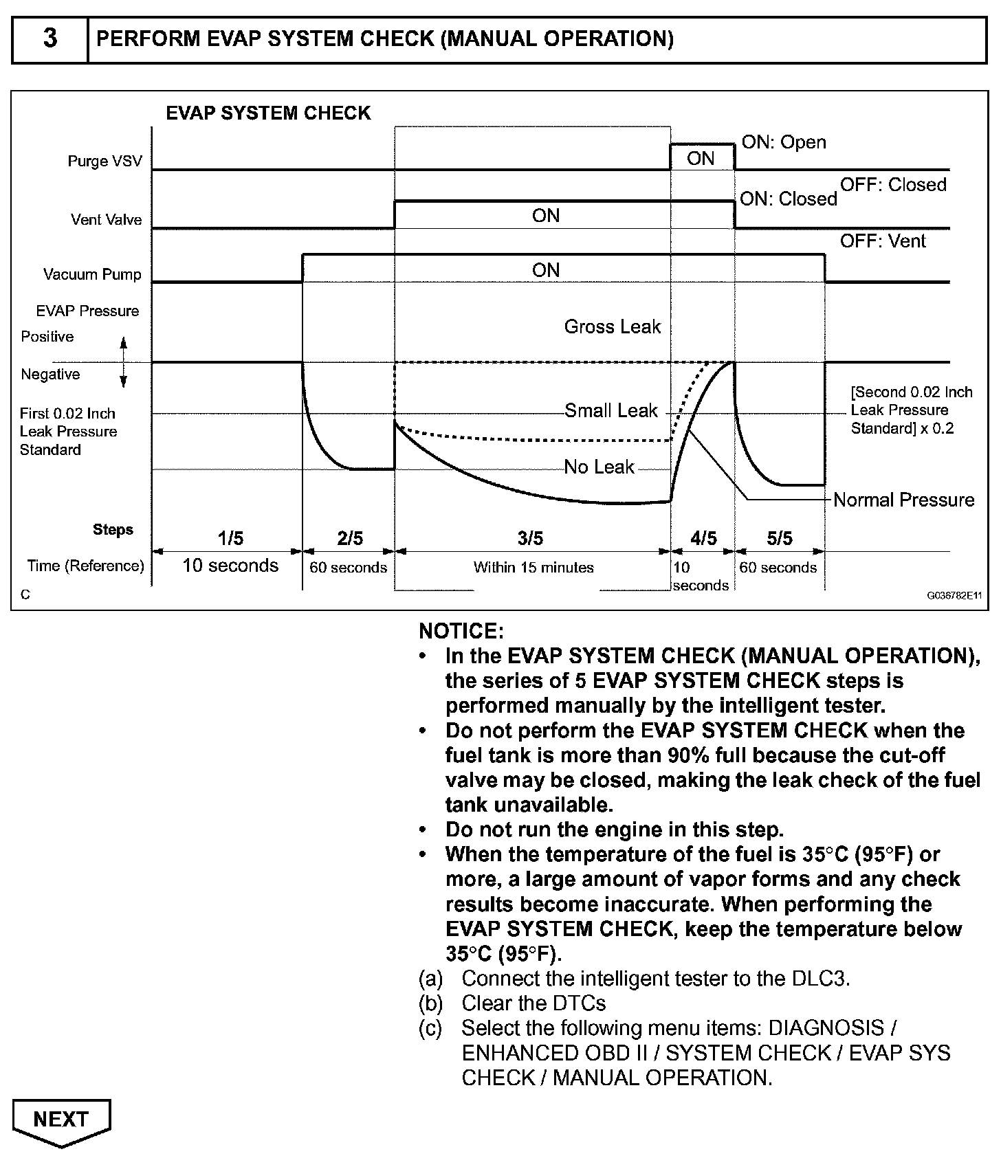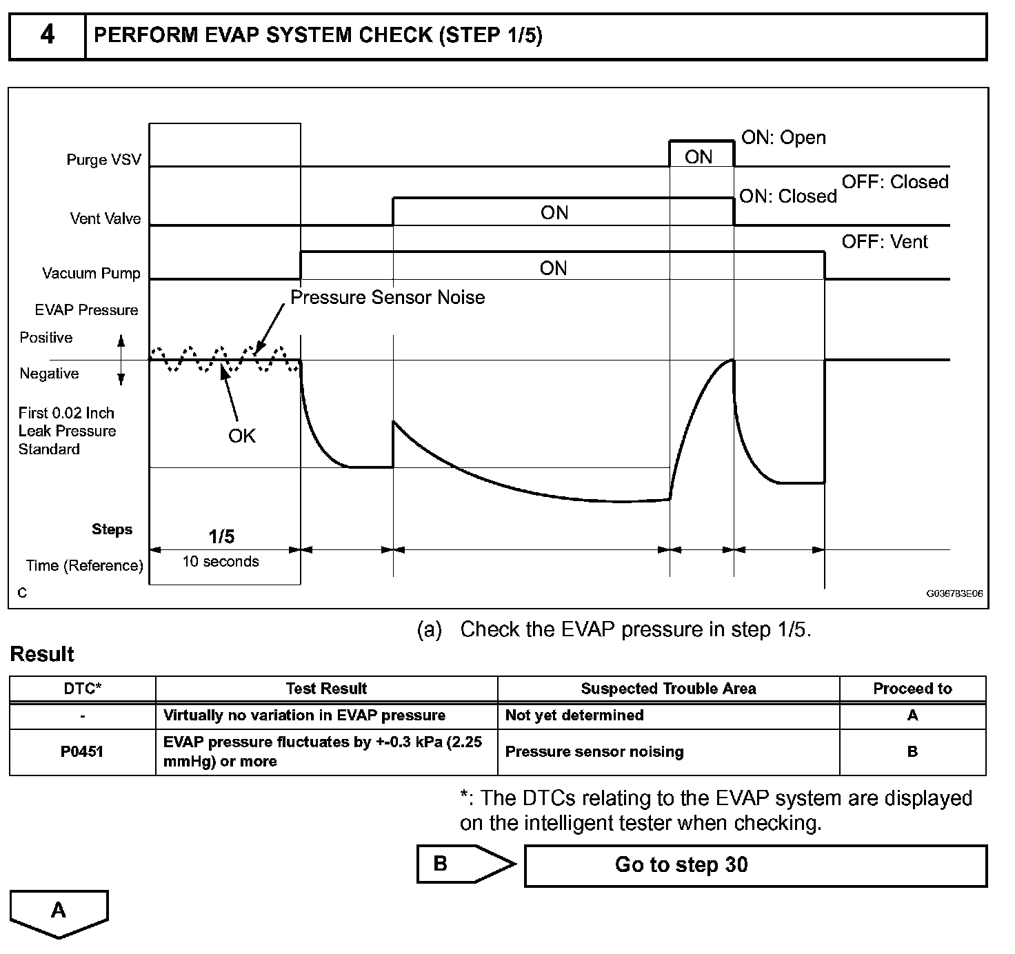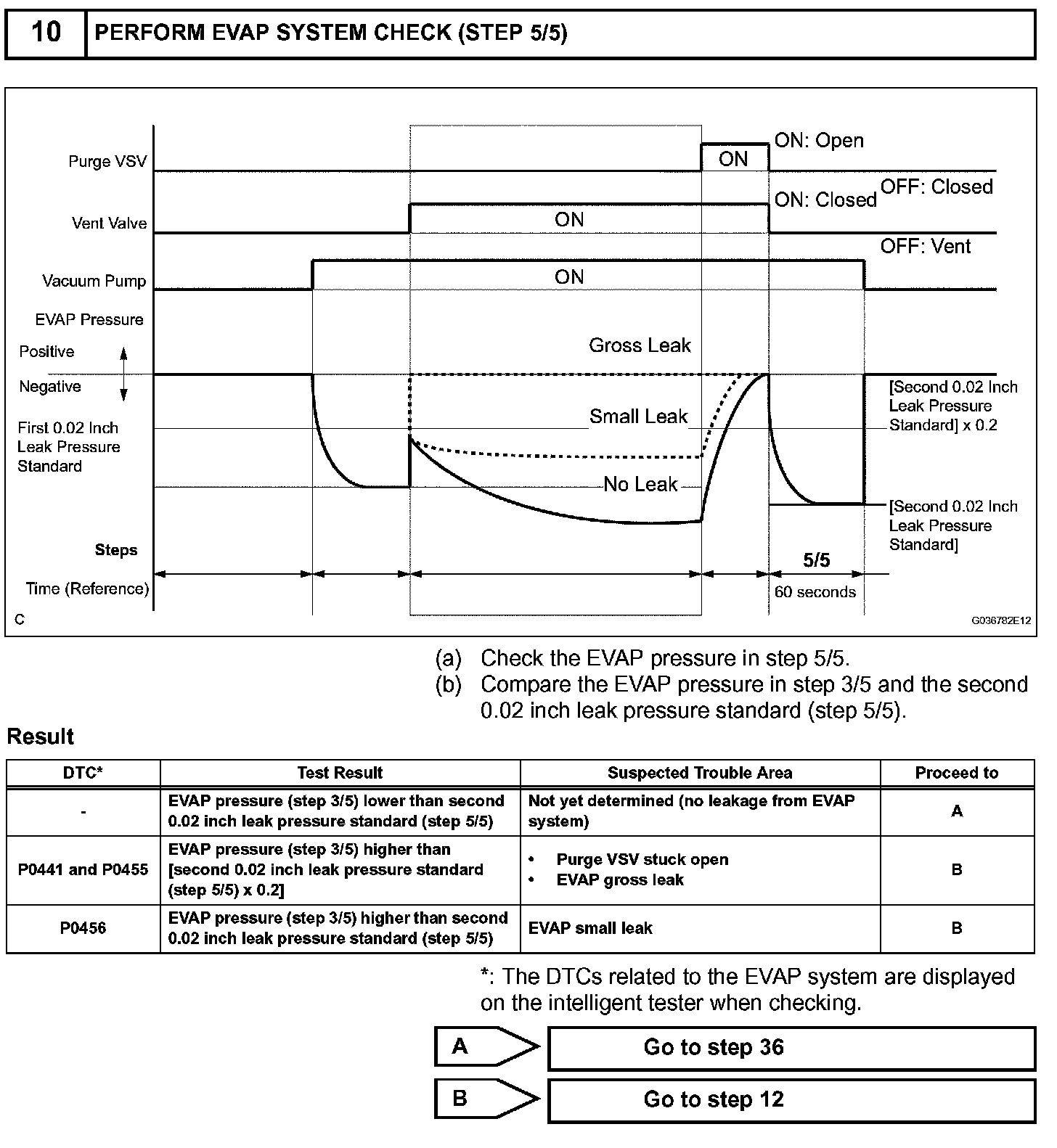 NOTE: If the 0.02 inch reference pressure difference between the first and second checks is greater than the specification, the DTCs corresponding to the reference pressure (P043E, P043F, P0441, P0455, P0456, P2401, P2420) will be all stored.