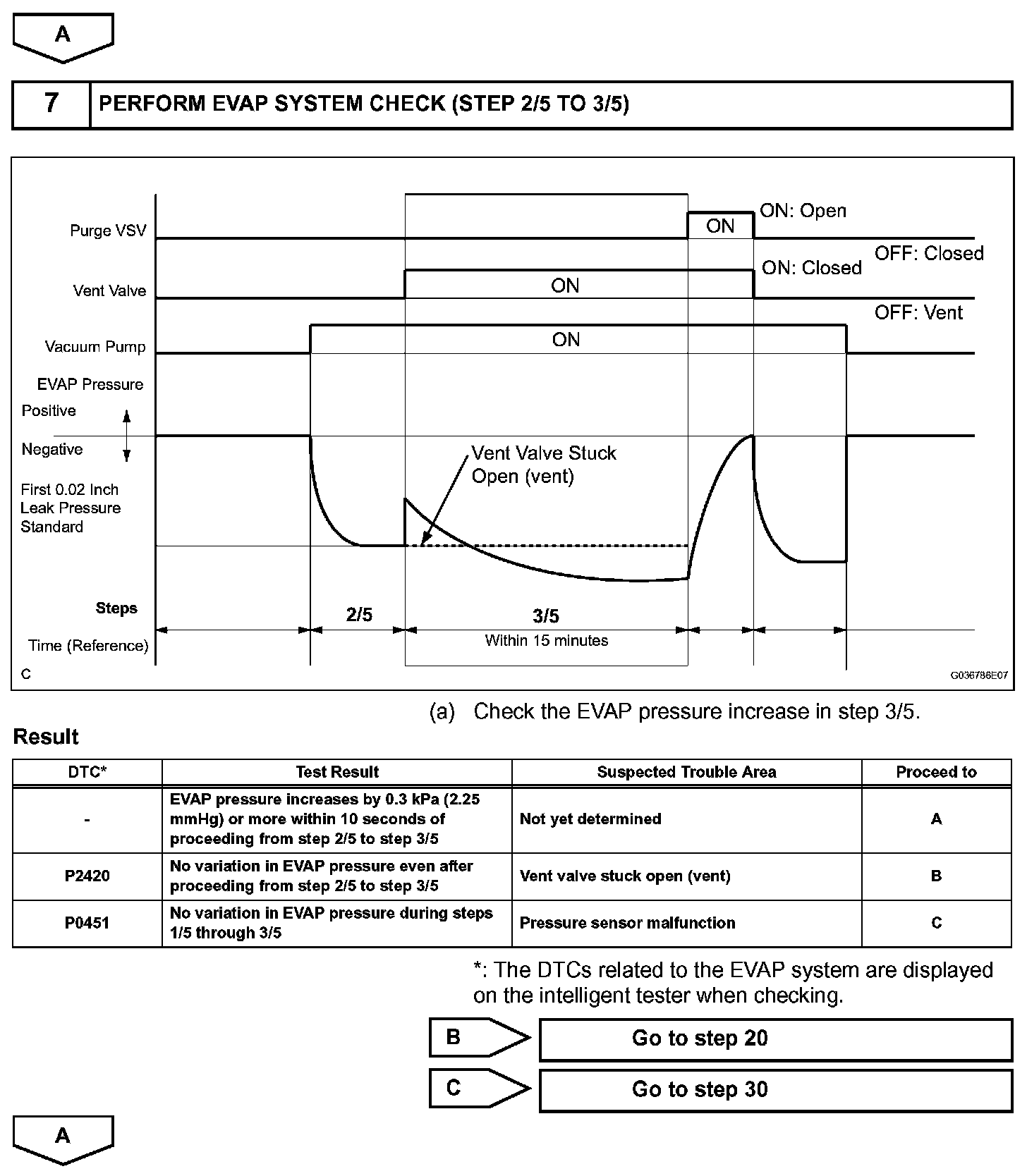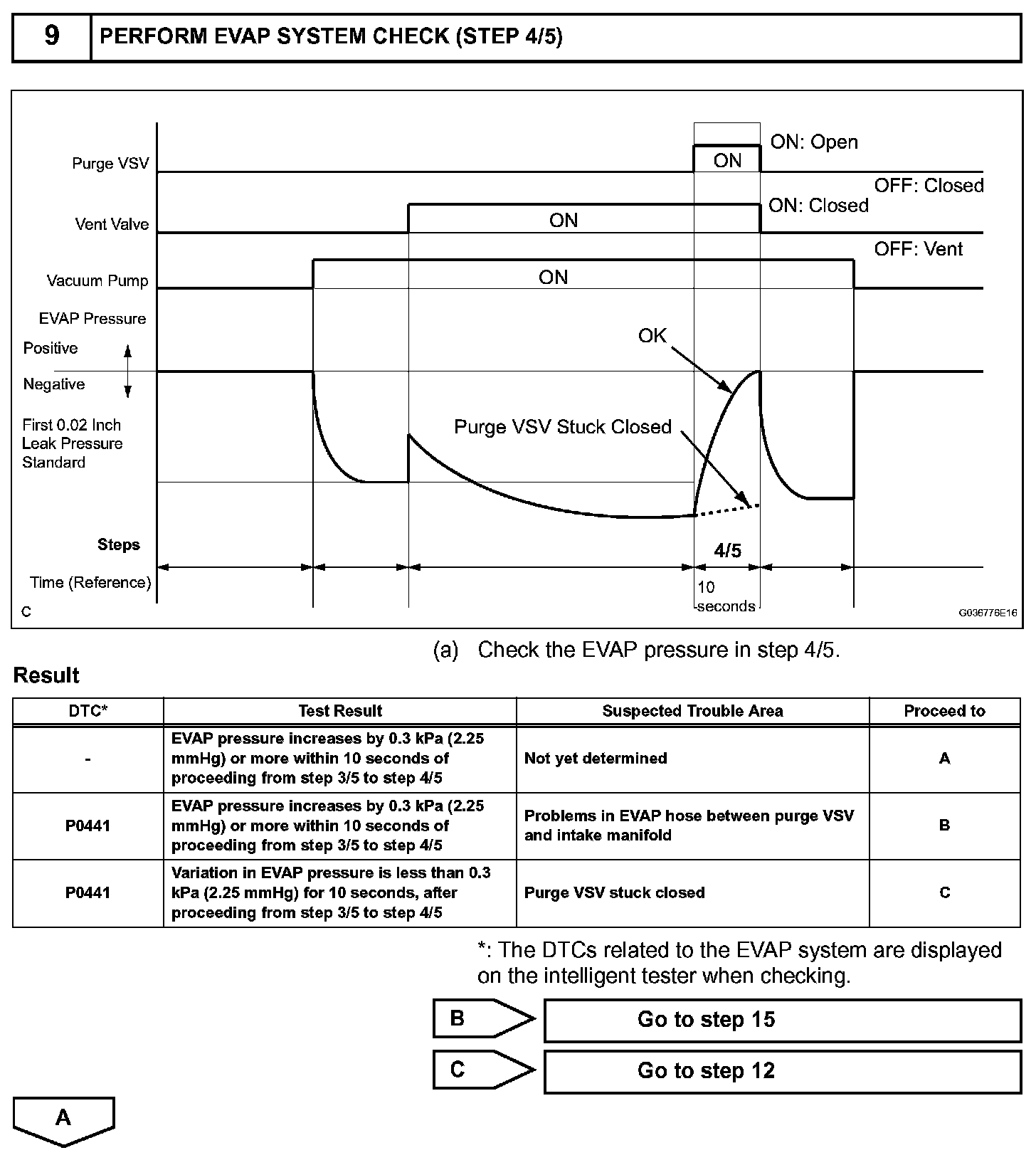 The vent valve is turned OFF (open) and the EVAP pressure is then measured. If the variation in the pressure is less than 0.5 kPa (3.75 mmHg), the ECM interprets this as the purge VSV being stuck closed, and illuminates the MIL and sets DTC P0441 (2 trip detection logic).