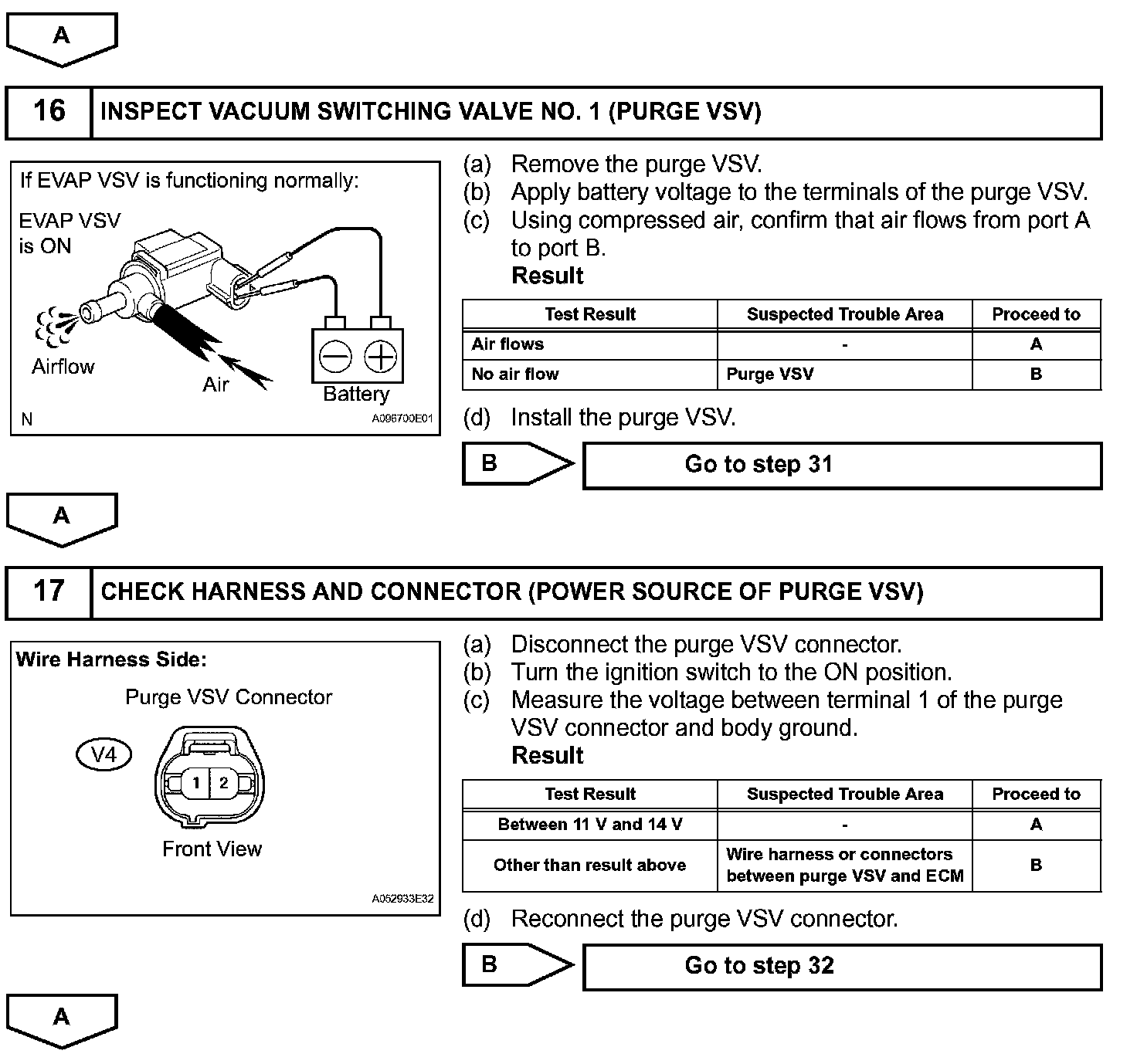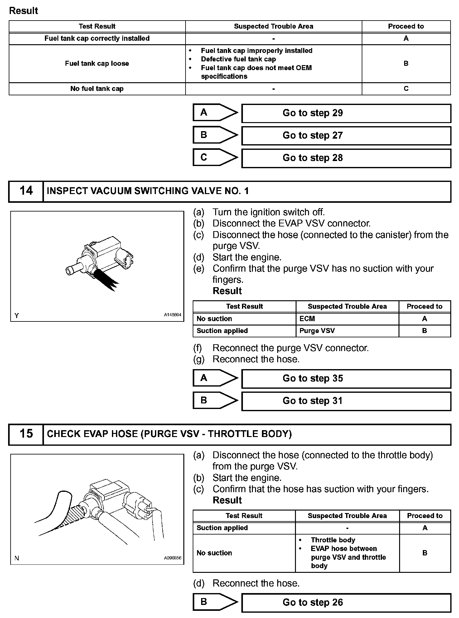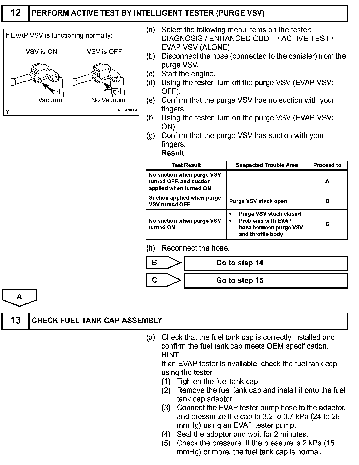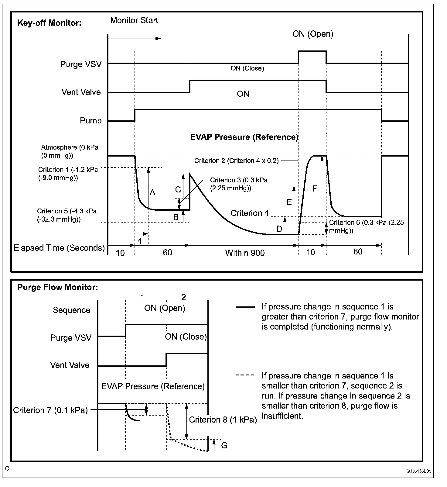 While the engine is running and the purge VSV (Vacuum Switching Valve) is ON (open), the ECM monitors the purge flow by measuring the EVAP pressure change. If negative pressure is not created, the ECM begins the 2nd monitor.