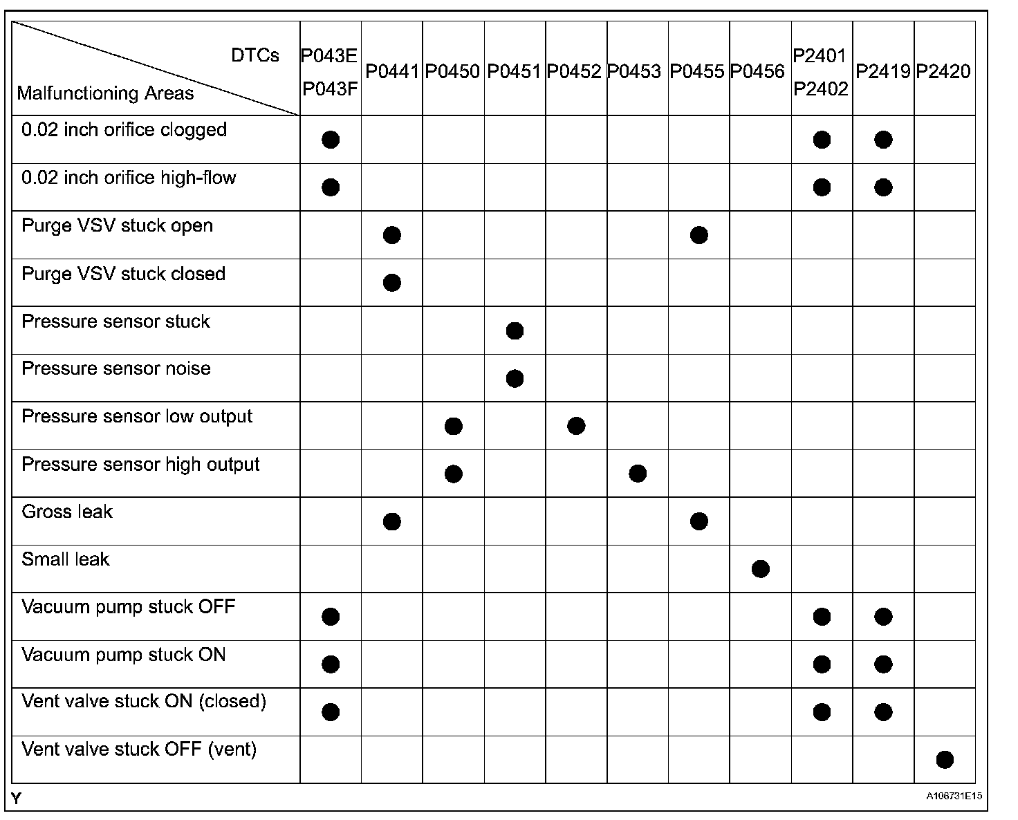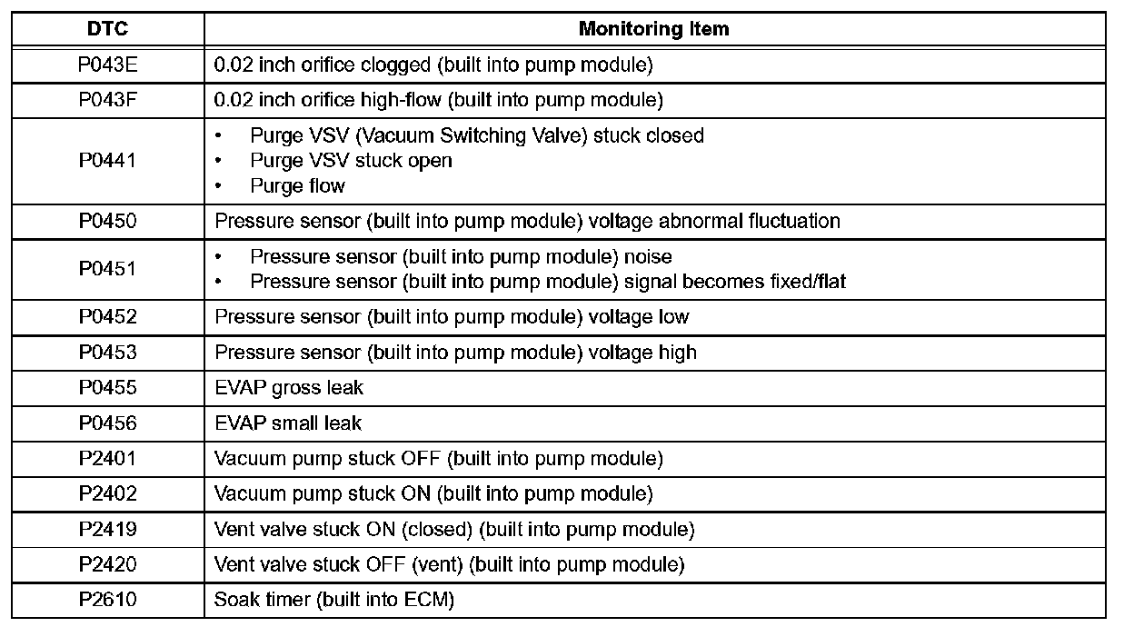 If any EVAP system DTCs are set, the malfunctioning area can be determined using the table given.