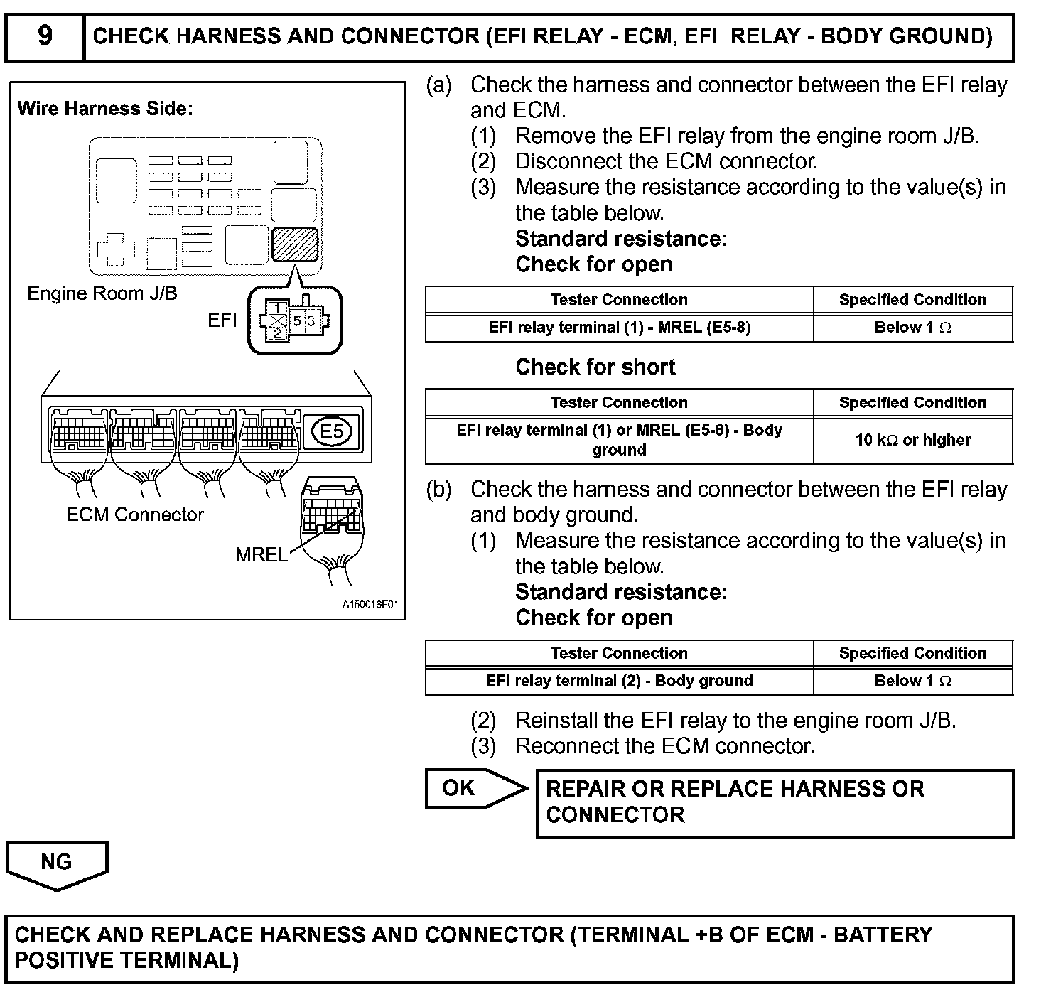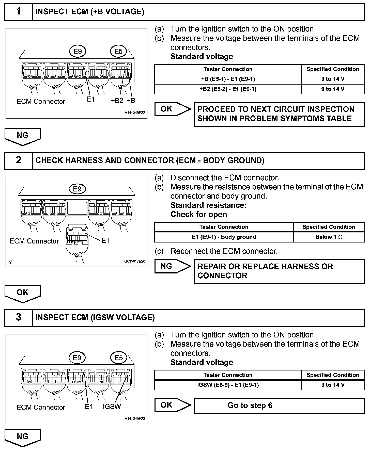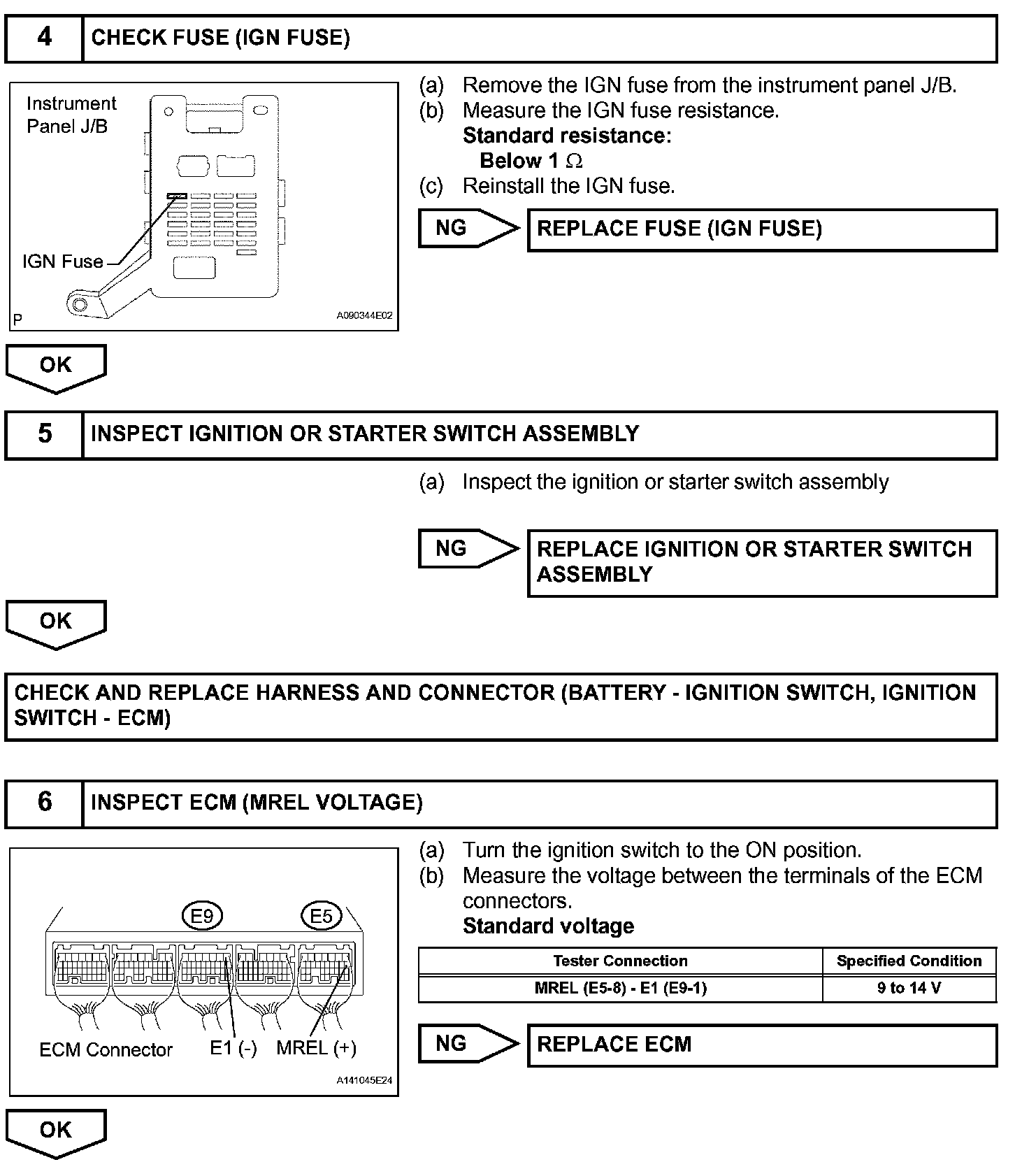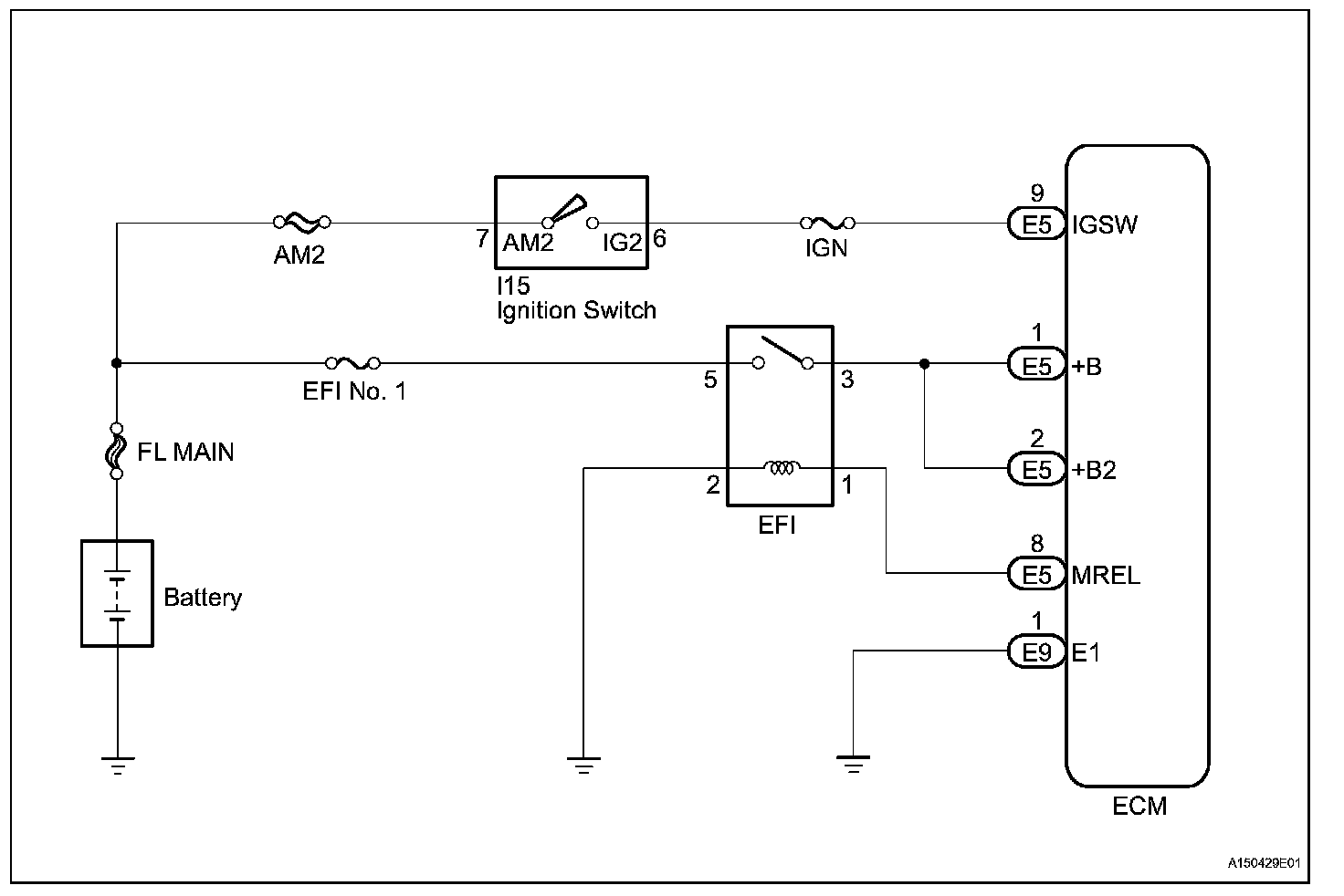 When the ignition switch is turned to the ON position, the battery voltage is applied to terminal IGSW of the ECM. The ECM MREL output signal causes a current to flow to the coil, closing the contacts of the EFI relay and supplying power to terminal +B of the ECM.