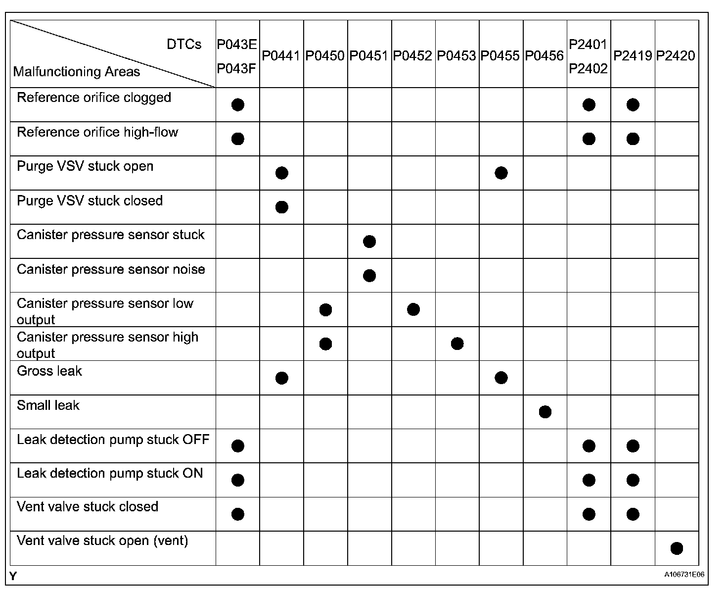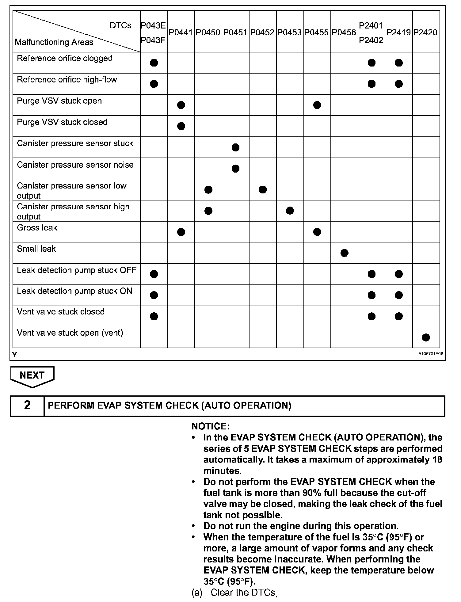 If any EVAP system DTCs are set, the malfunctioning area can be determined using the given table.