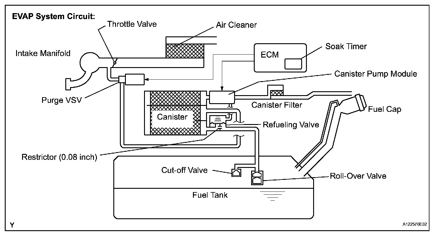 While the engine is running, if a predetermined condition (closed-loop etc.) is met, the purge VSV is opened by the ECM and stored fuel vapors in the canister are purged to the intake manifold. The ECM changes the duty cycle ratio of the purge VSV to control purge flow volume.