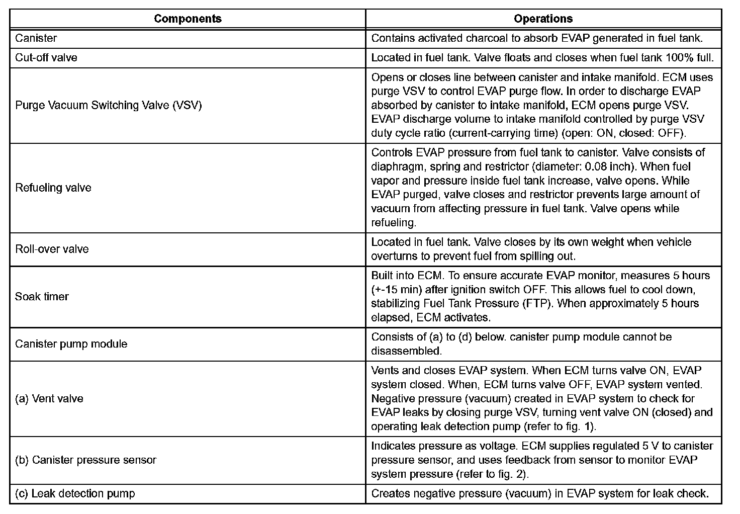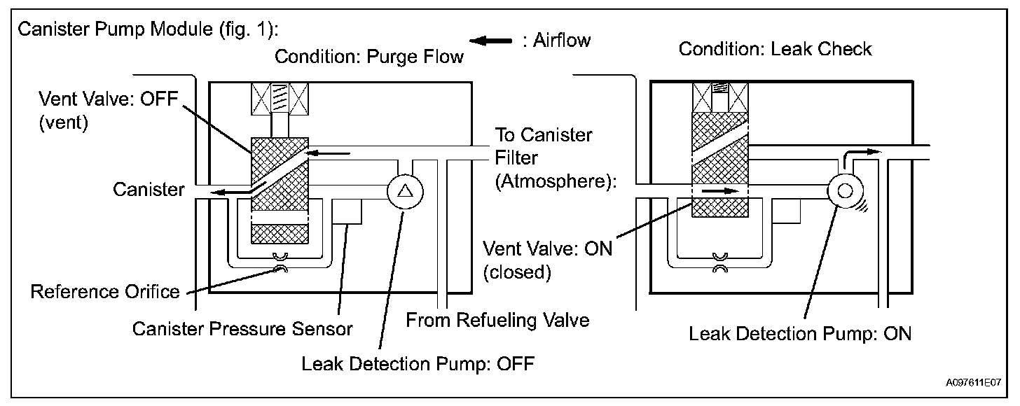 The leak detection pump creates negative pressure (vacuum) in the EVAP system and the pressure is measured. Finally, the ECM monitors for leaks from the EVAP system and malfunctions in both the canister pump module and purge VSV, based on the EVAP pressure.