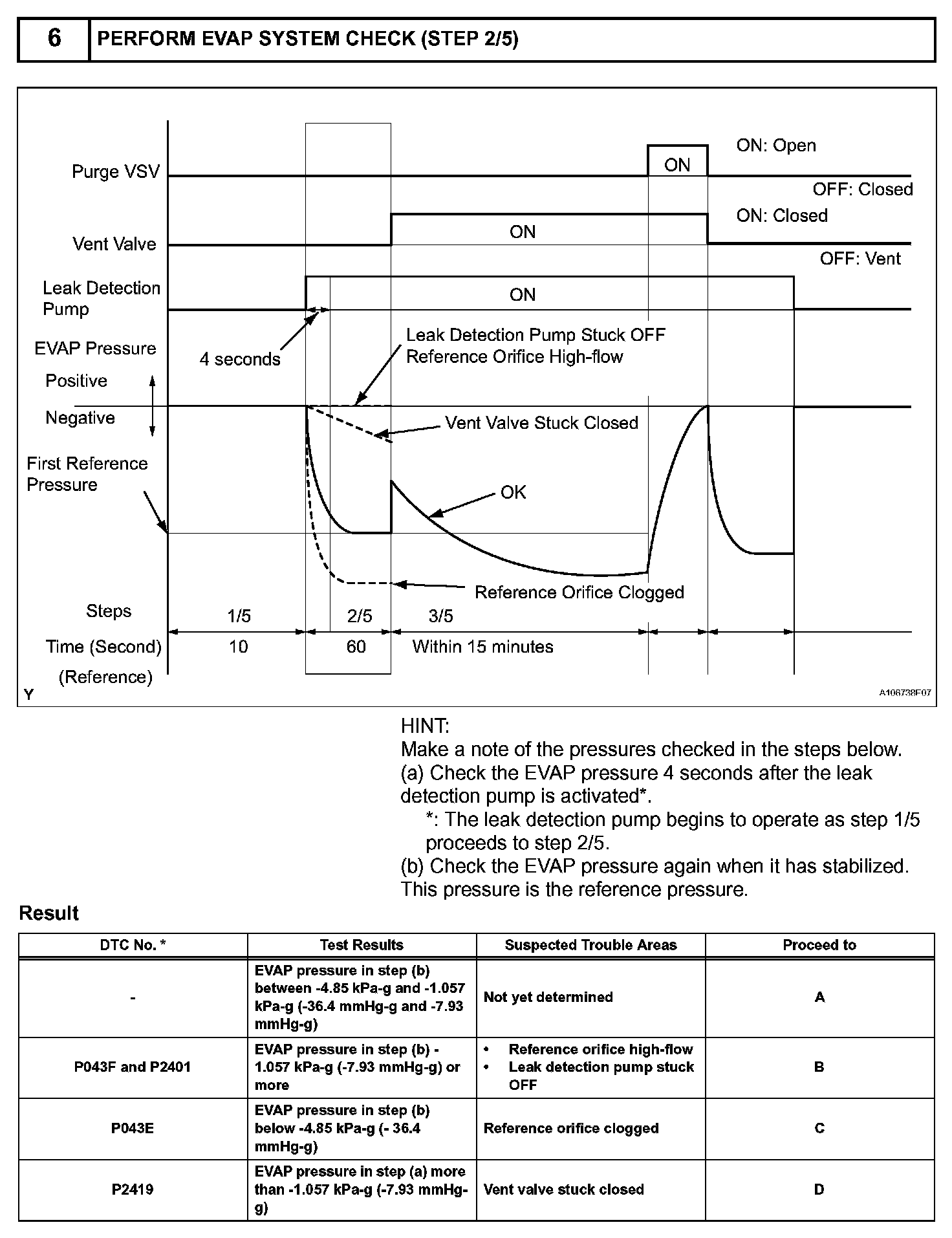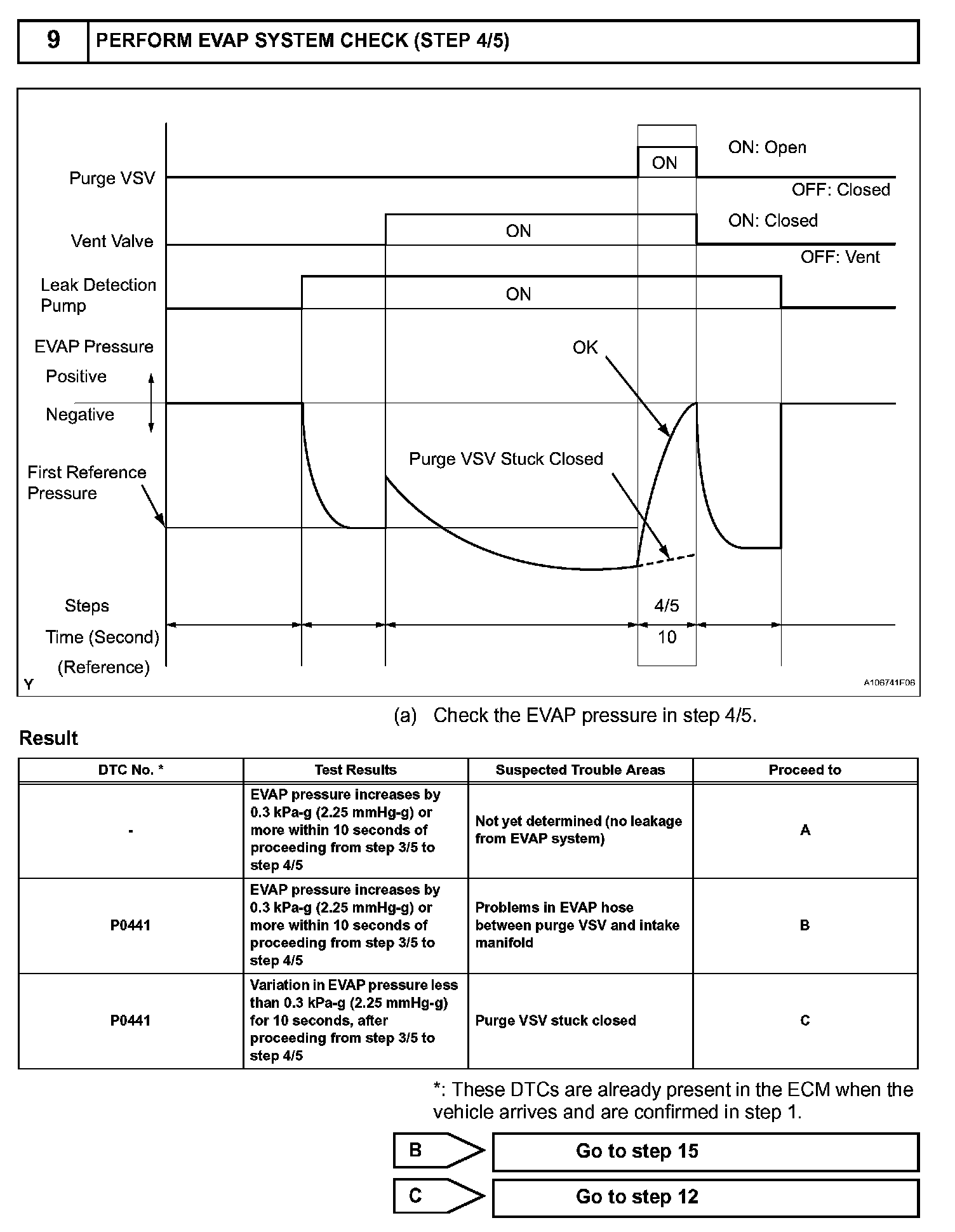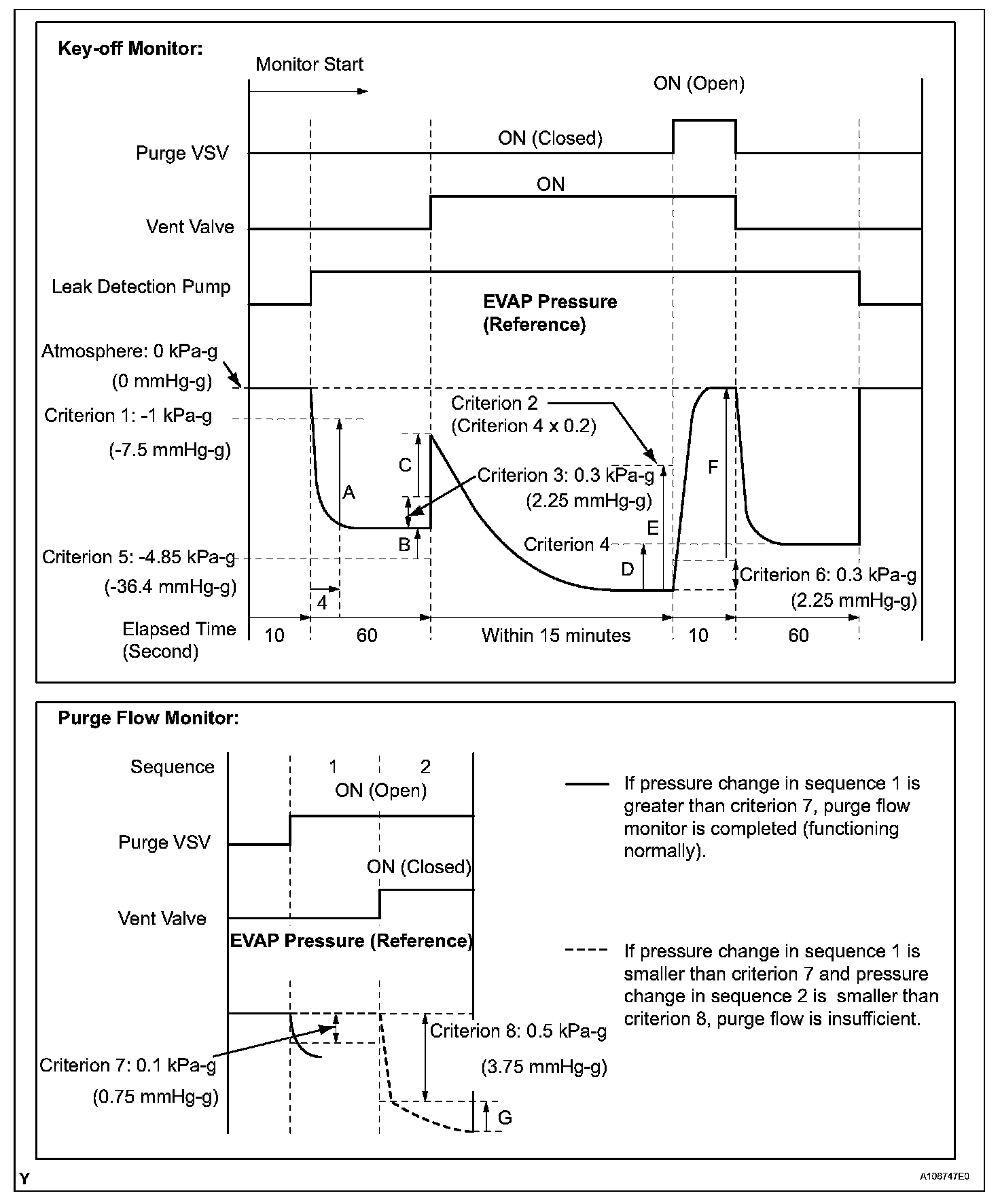 The vent valve turned OFF (open) and the EVAP pressure is then measured. If the variation in the pressure is less than 0.5 kPa-g (3.75 mmHg-g), the ECM interprets this as the purge VSV being stuck closed, and illuminates the MIL and sets DTC P0441 (2 trip detection logic).