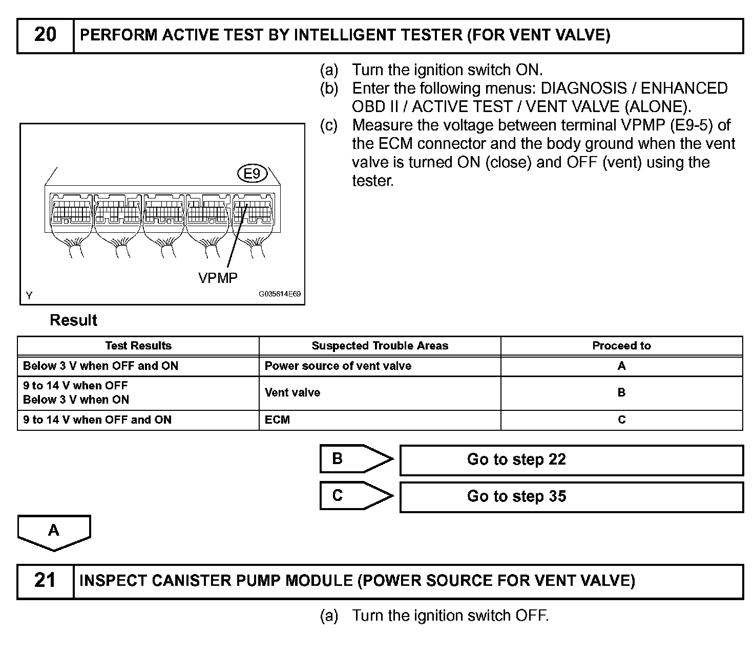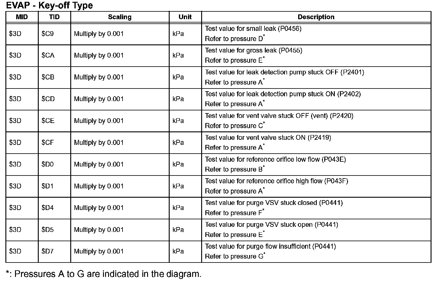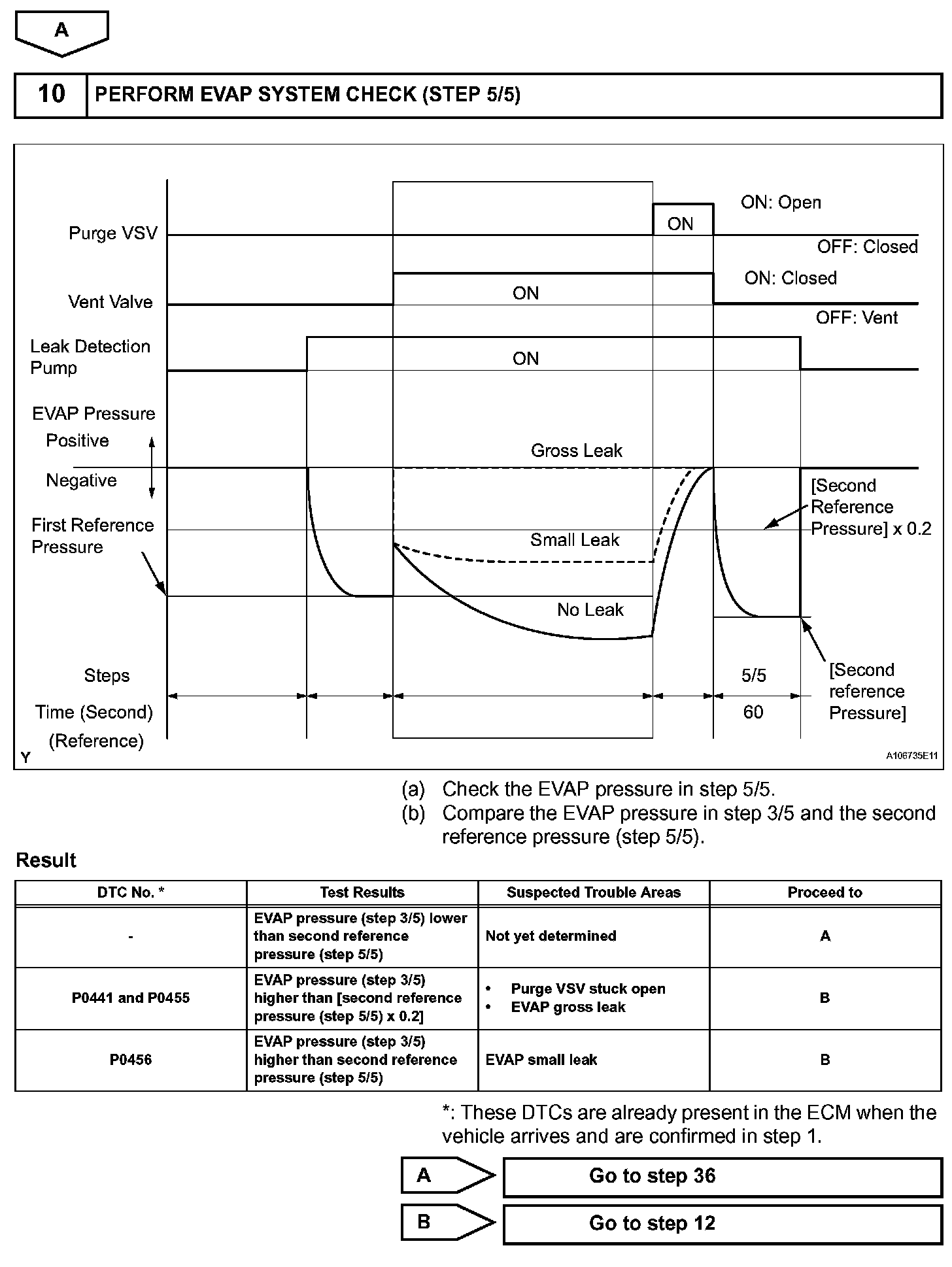 The vent valve turned OFF (open) and the EVAP pressure is then measured. If the variation in the pressure is less than 0.5 kPa-g (3.75 mmHg-g), the ECM interprets this as the purge VSV being stuck closed, and illuminates the MIL and sets DTC P0441 (2 trip detection logic).