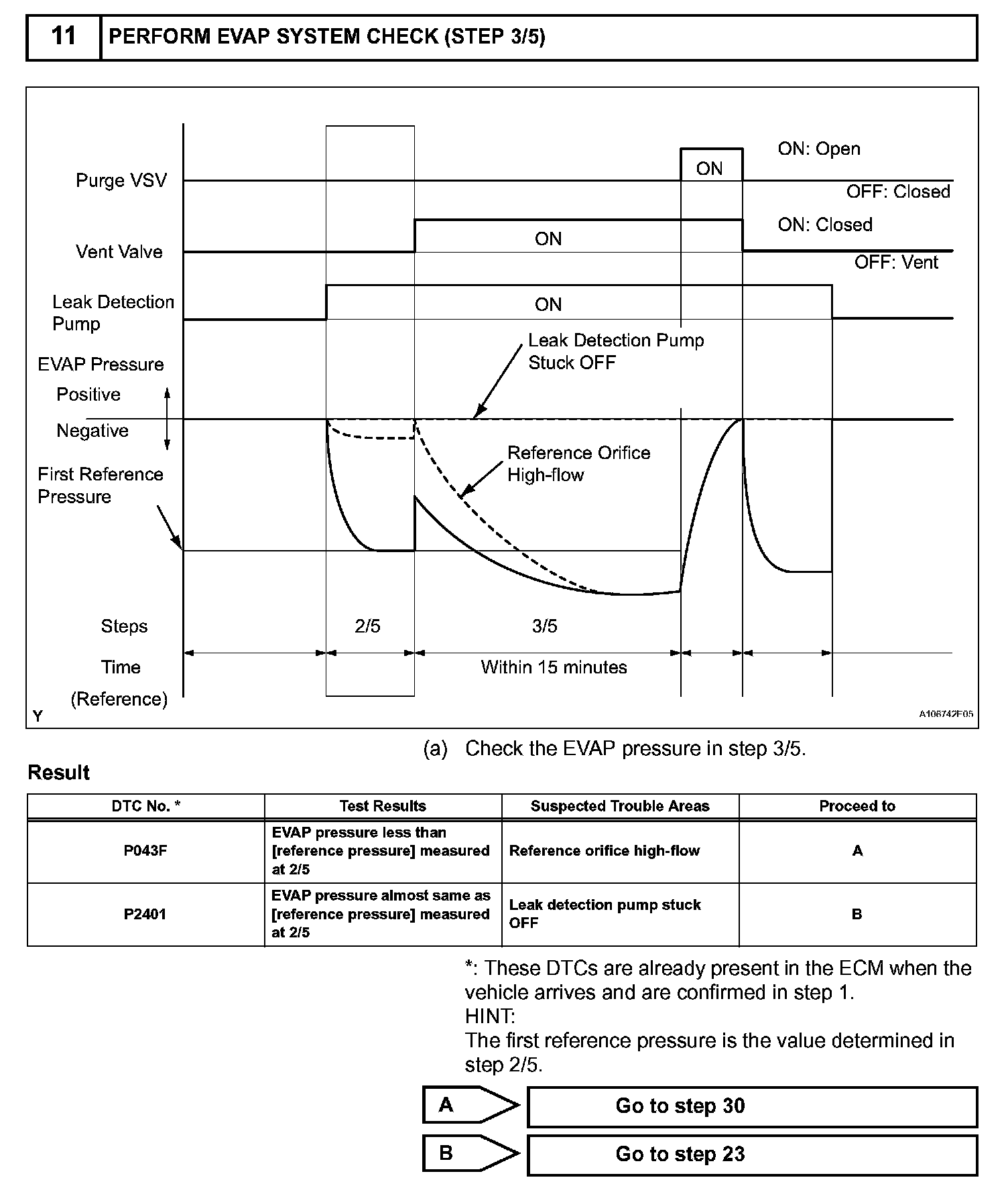NOTE: If the reference pressure difference between the first and second checks is greater than the specification, the DTCs corresponding to the reference pressure (P043E, P043F, P2401, P2402 and P2419) will all be stored.