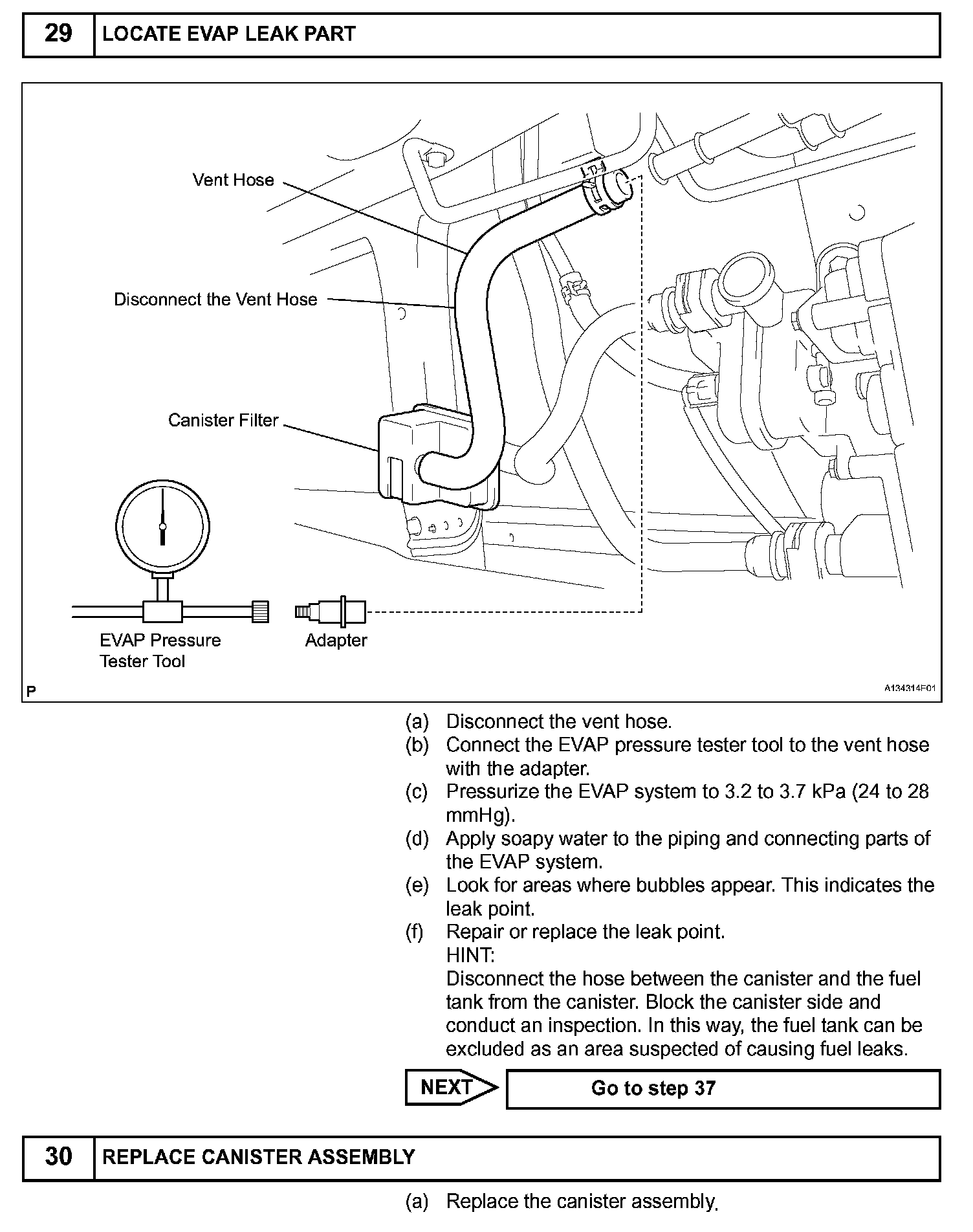NOTE: In this vehicle's EVAP system, turning ON the vent valve does not seal off the EVAP system. To check for leaks in the EVAP system, disconnect the air inlet vent hose and apply pressure from the atmospheric side of the canister.
