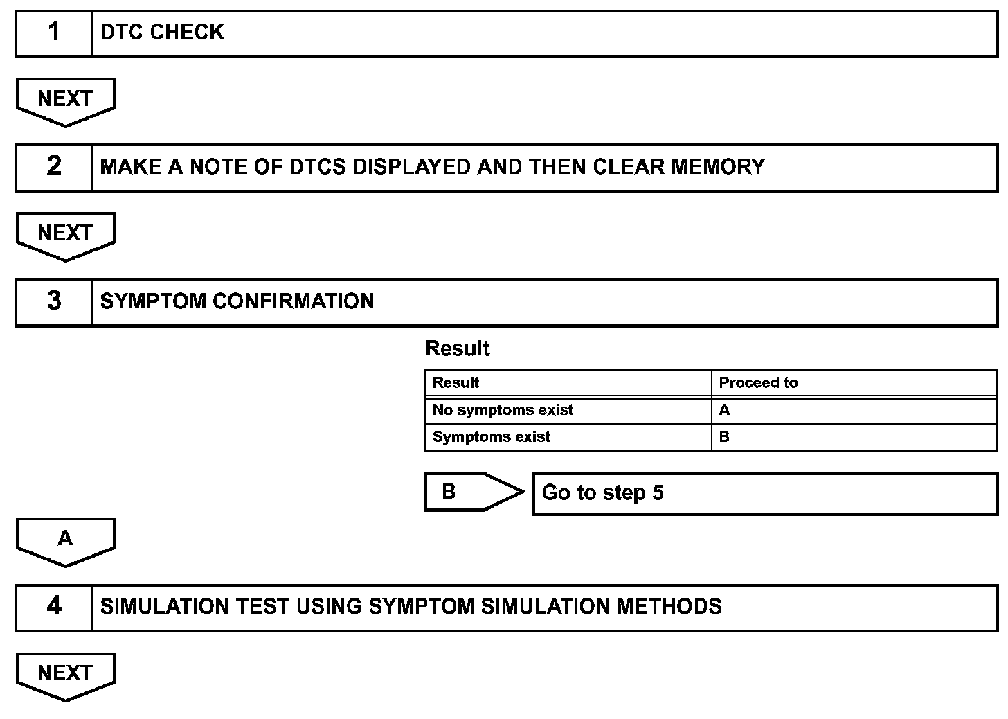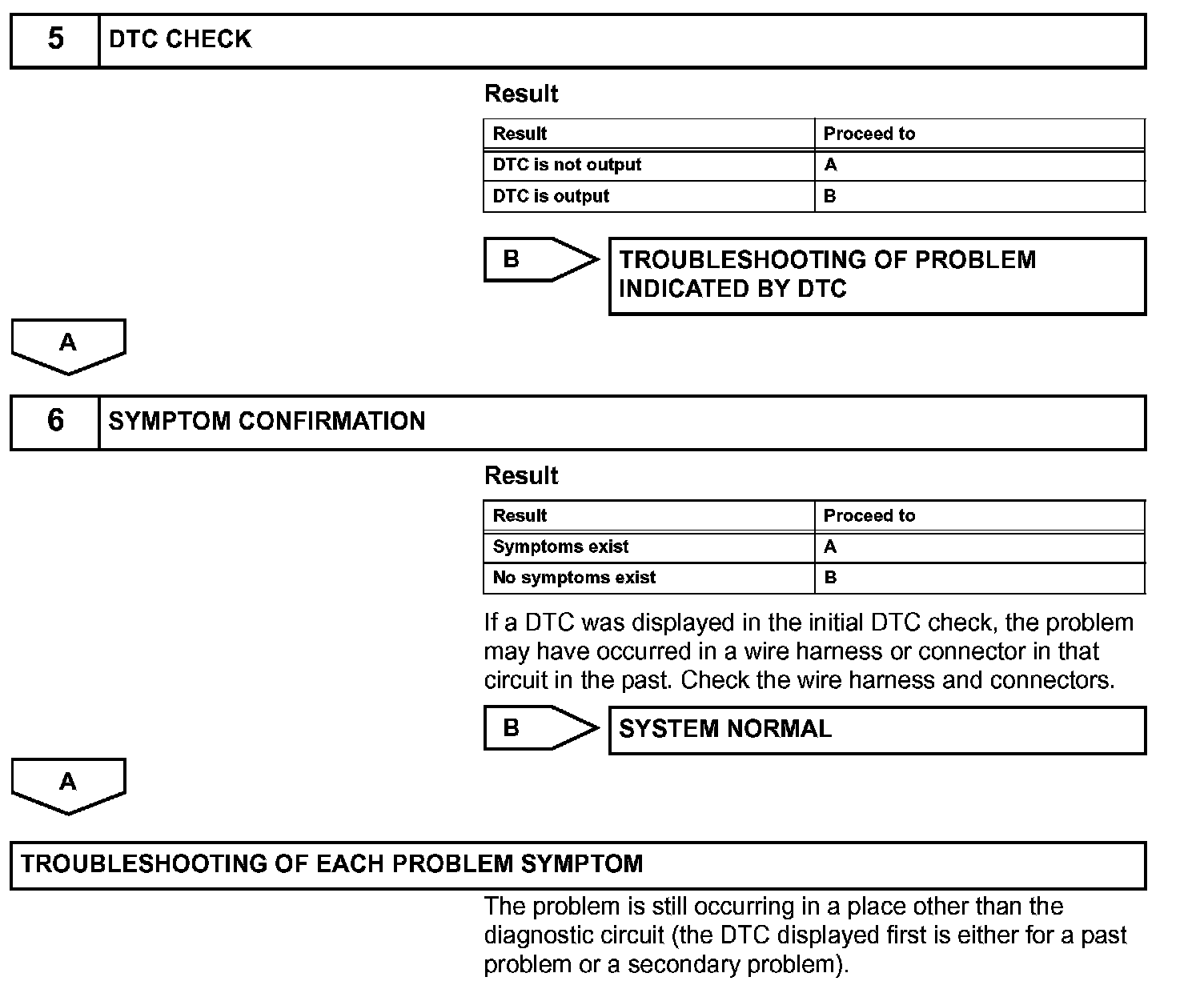 - In the DTC check, it is very important to determine whether the problem indicated by the DTC is either: 1) still occurring, or 2) occurred in the past but has since returned to normal. In addition, the DTC should be compared to the problem symptom to see if they are related. For this reason, DTCs should be checked before and after confirmation of symptoms (i.e., whether or not problem symptoms exist) to determine current system conditions, as shown in the flowchart.