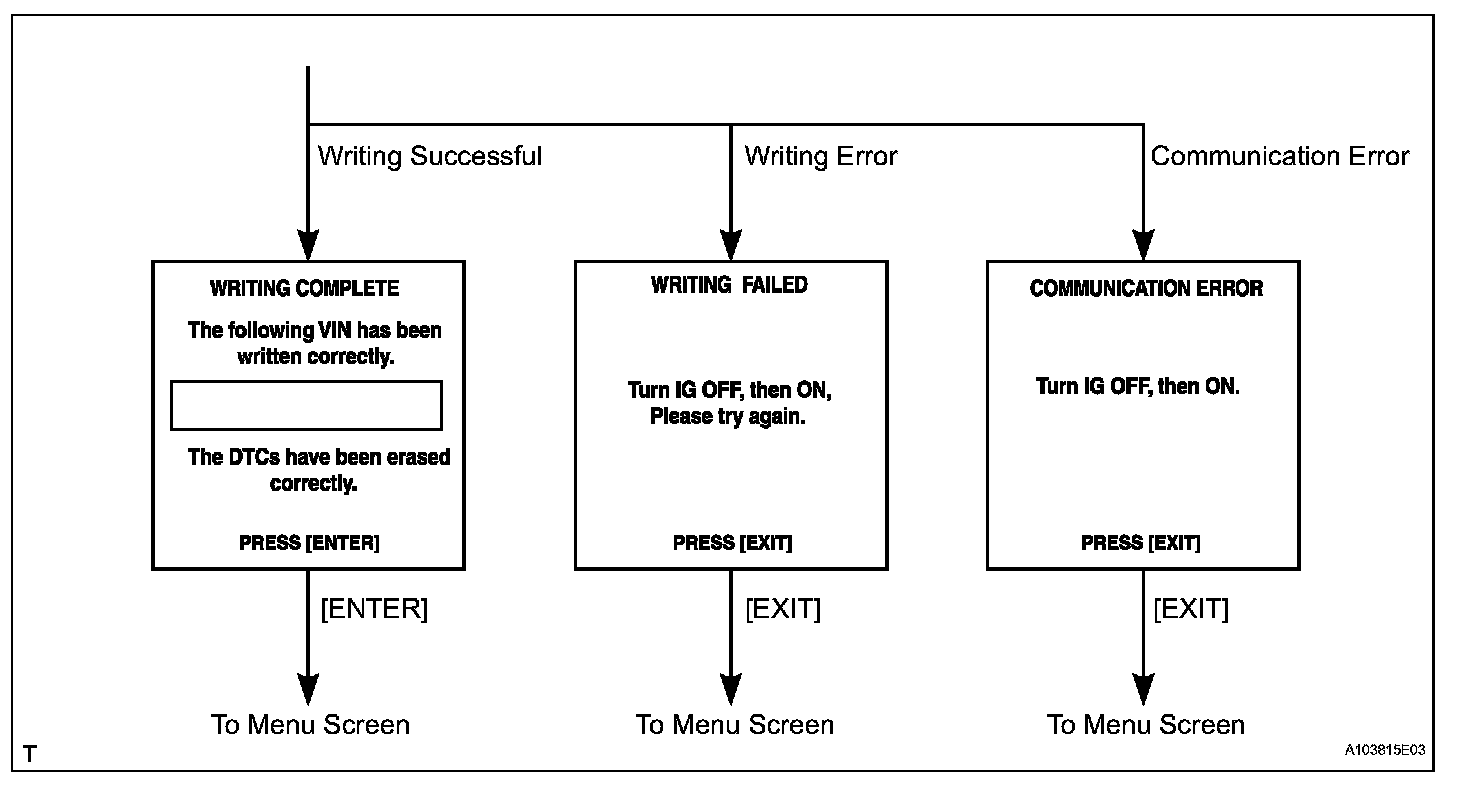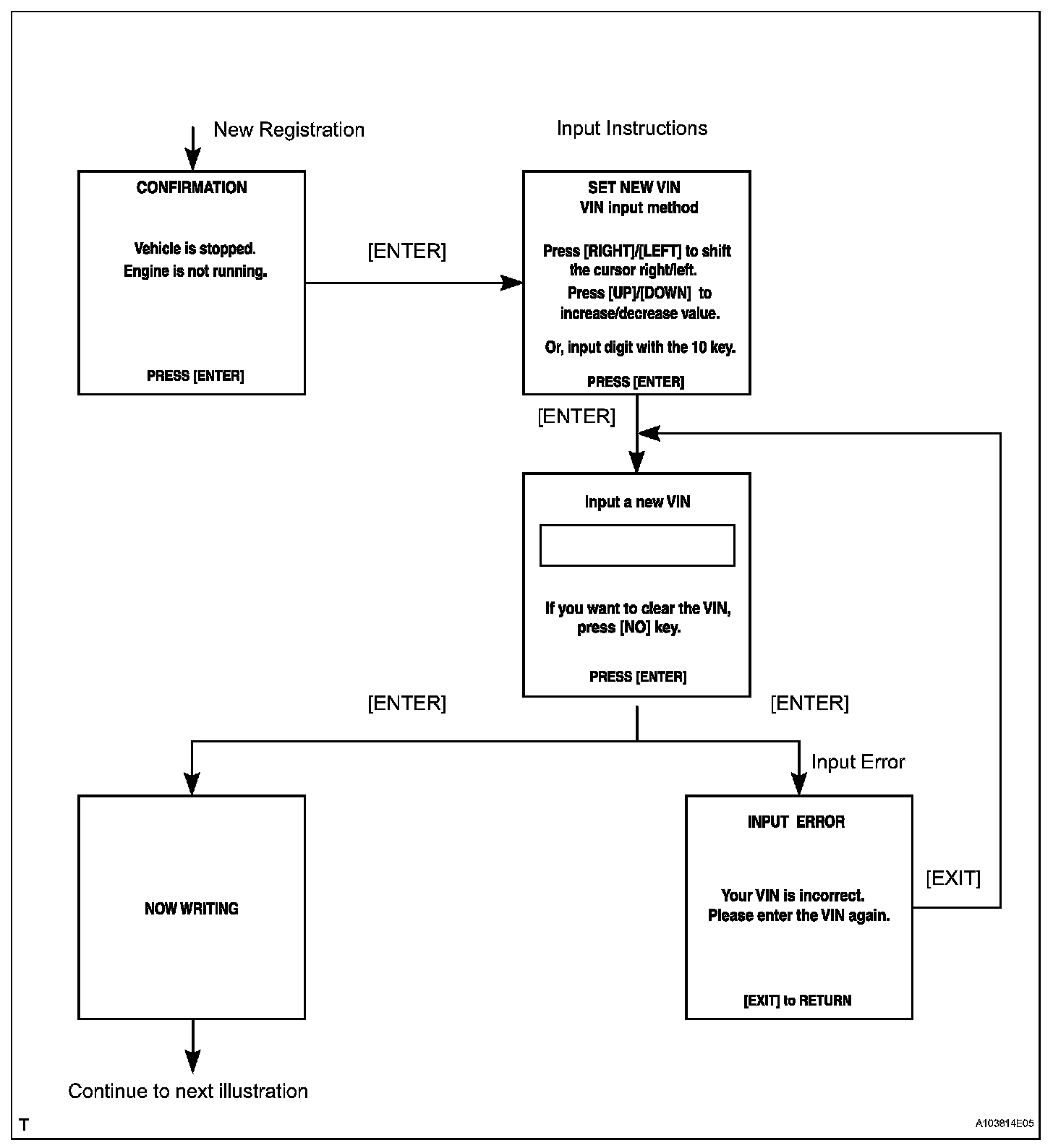 c. Write VIN: Explains the VIN writing process in a flowchart. This process allows the VIN to be input into the ECM. If the ECM is changed, or the vehicle VIN and ECM VIN do not match, the VIN can be registered or overwritten in the ECM by following this procedure.