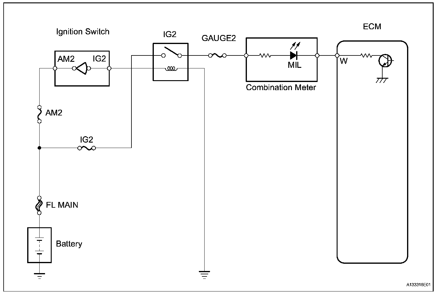 The MIL (Malfunction Indicator Lamp) is used to indicate vehicle malfunction detections by the ECM. When the ignition switch is turned ON, power is supplied to the MIL circuit, and the ECM provides the circuit ground which illuminates the MIL.