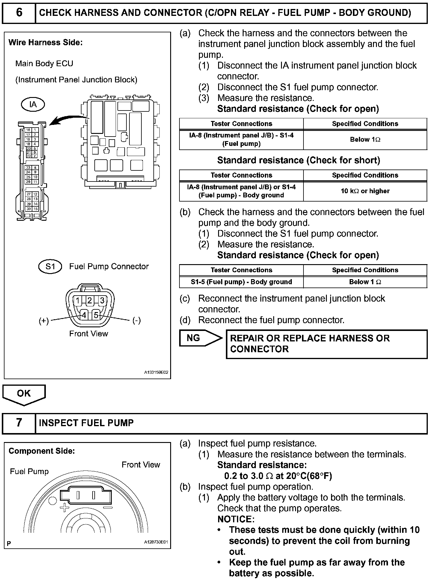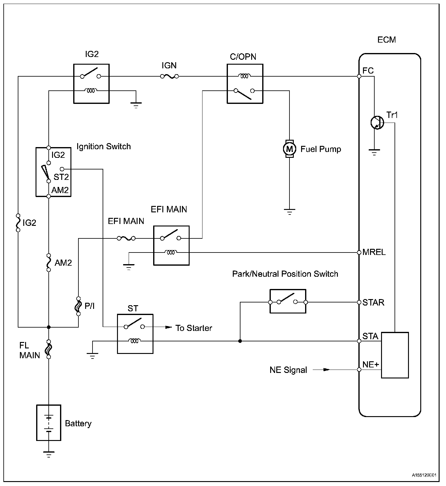 When the engine is cranked, the starter relay drive signal output from the STAR terminal of the ECM is input into the STA terminal of the ECM, and NE signal generated by the crankshaft position sensor is also input into the NE+ terminal. Thus, the ECM interprets that the engine is cranked, and turns the transistor Tr1 in the ECM internal circuit ON. The current flows to the C/OPN (Circuit Opening) relay by turning the Tr1 ON. Then, the fuel pump operates.