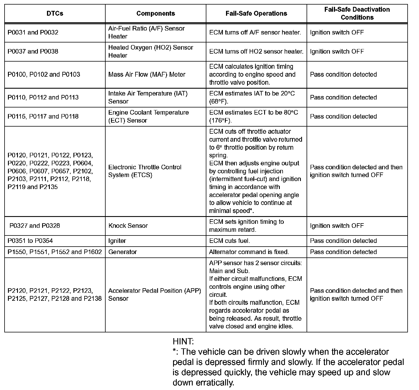 If any of the given DTCs are set, the ECM enters fail-safe mode to allow the vehicle to be driven temporarily.