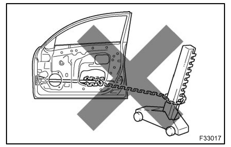 (1) Rustproof high strength steel sheets are used for the body frame. Therefore, if these parts are heat repaired using an acetylene torch or equivalent, the crystalline structure changes, causing the strength of the steel sheets to decrease.