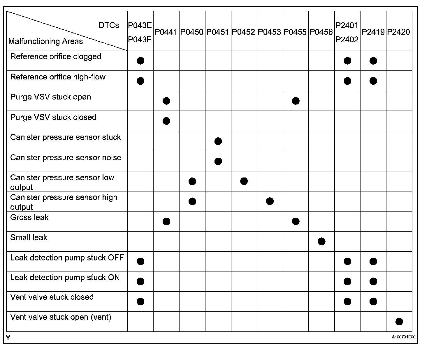 If any EVAP system DTCs are set, the malfunctioning area can be determined using the table.