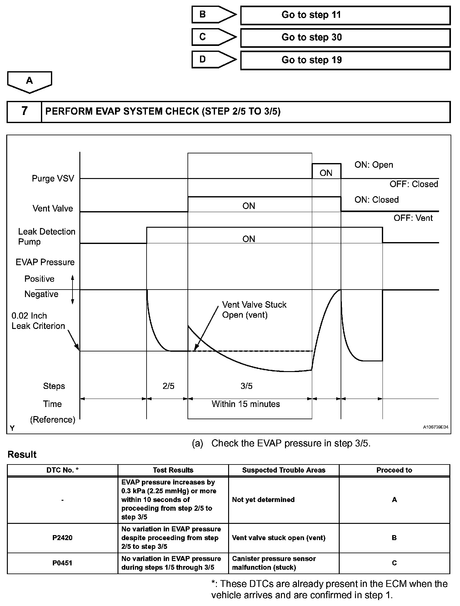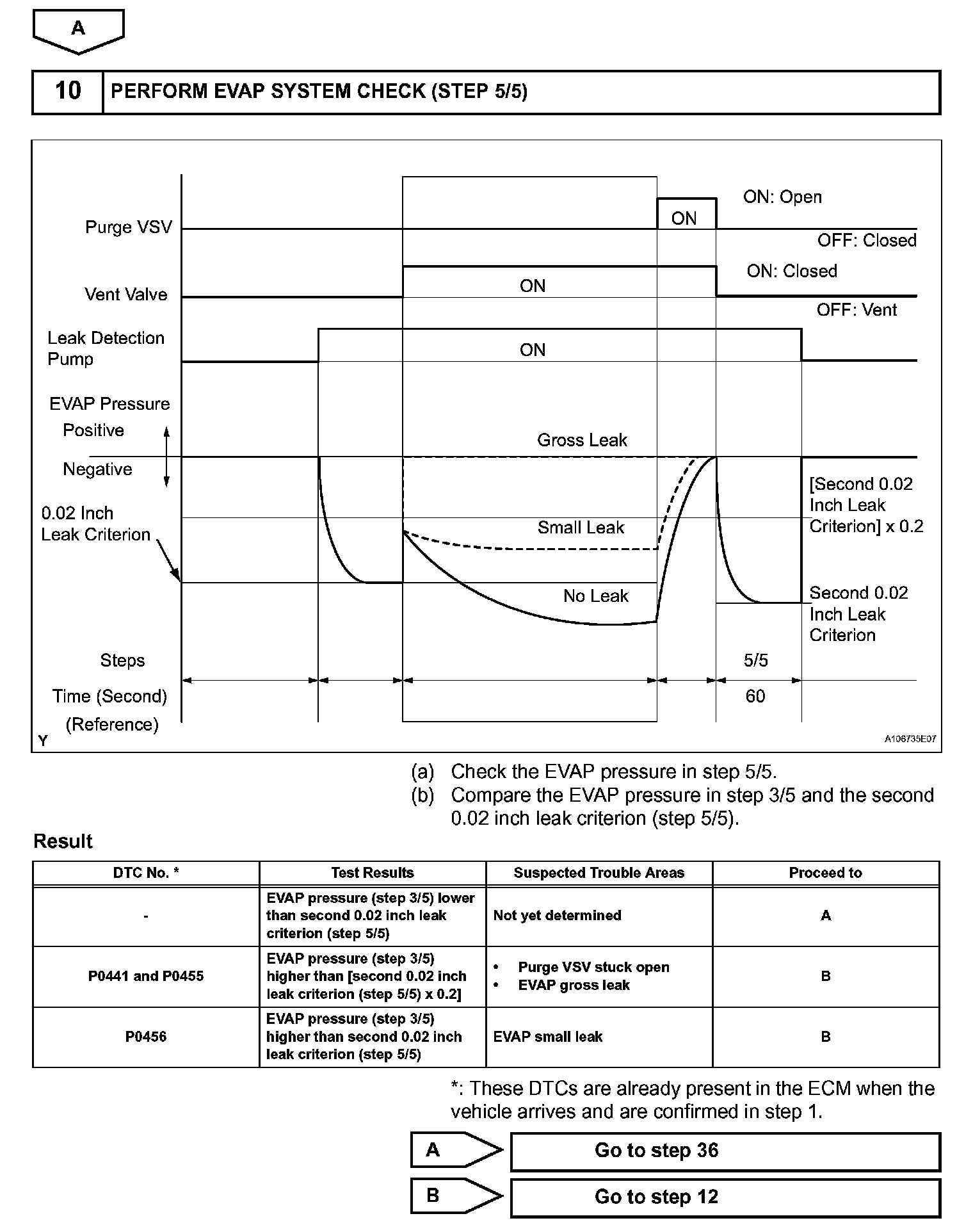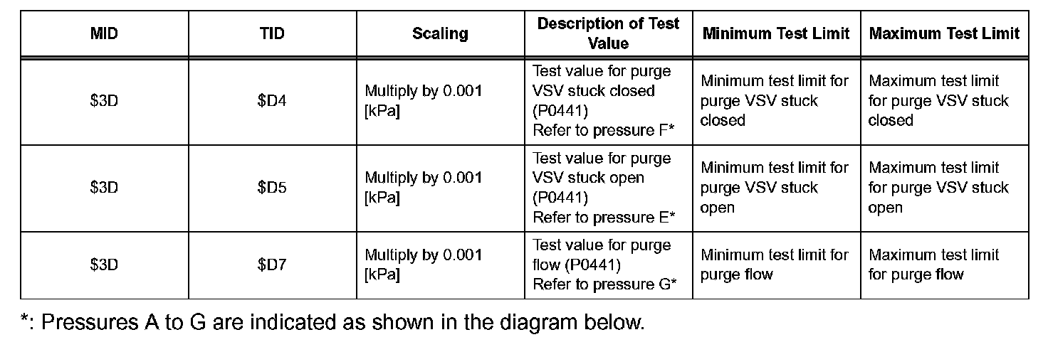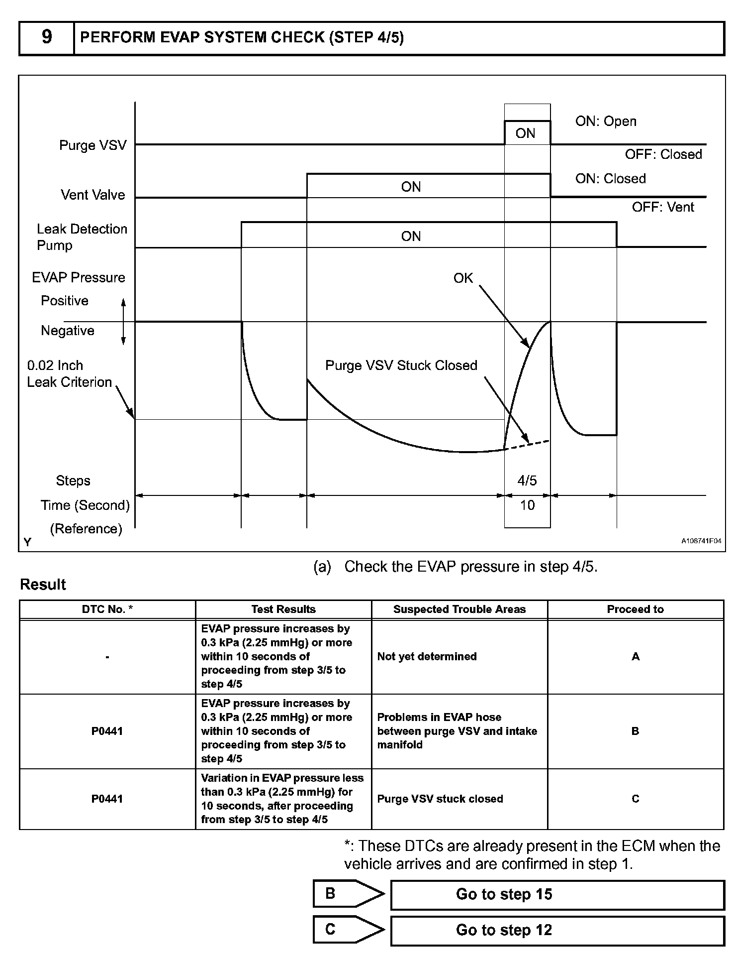 The vent valve turned OFF (open) and the EVAP pressure is then measured. If the variation in the pressure is less than 0.5 kPa (3.75 mmHg), the ECM interprets this as the purge VSV being stuck closed, and illuminates the MIL and sets DTC P0441 (2 trip detection logic).