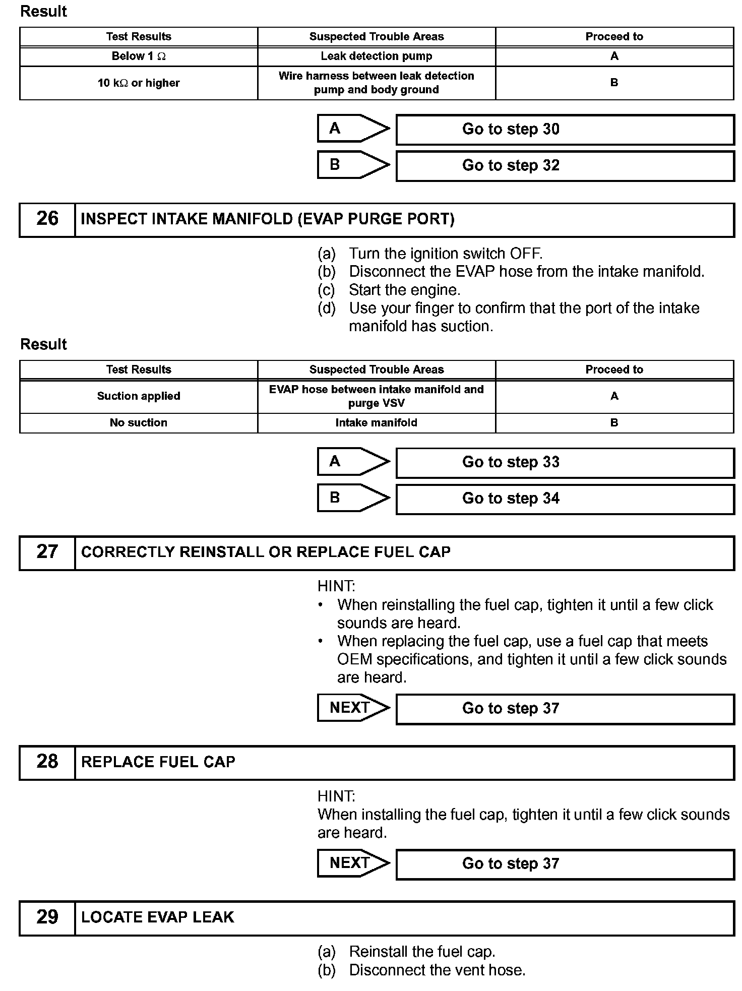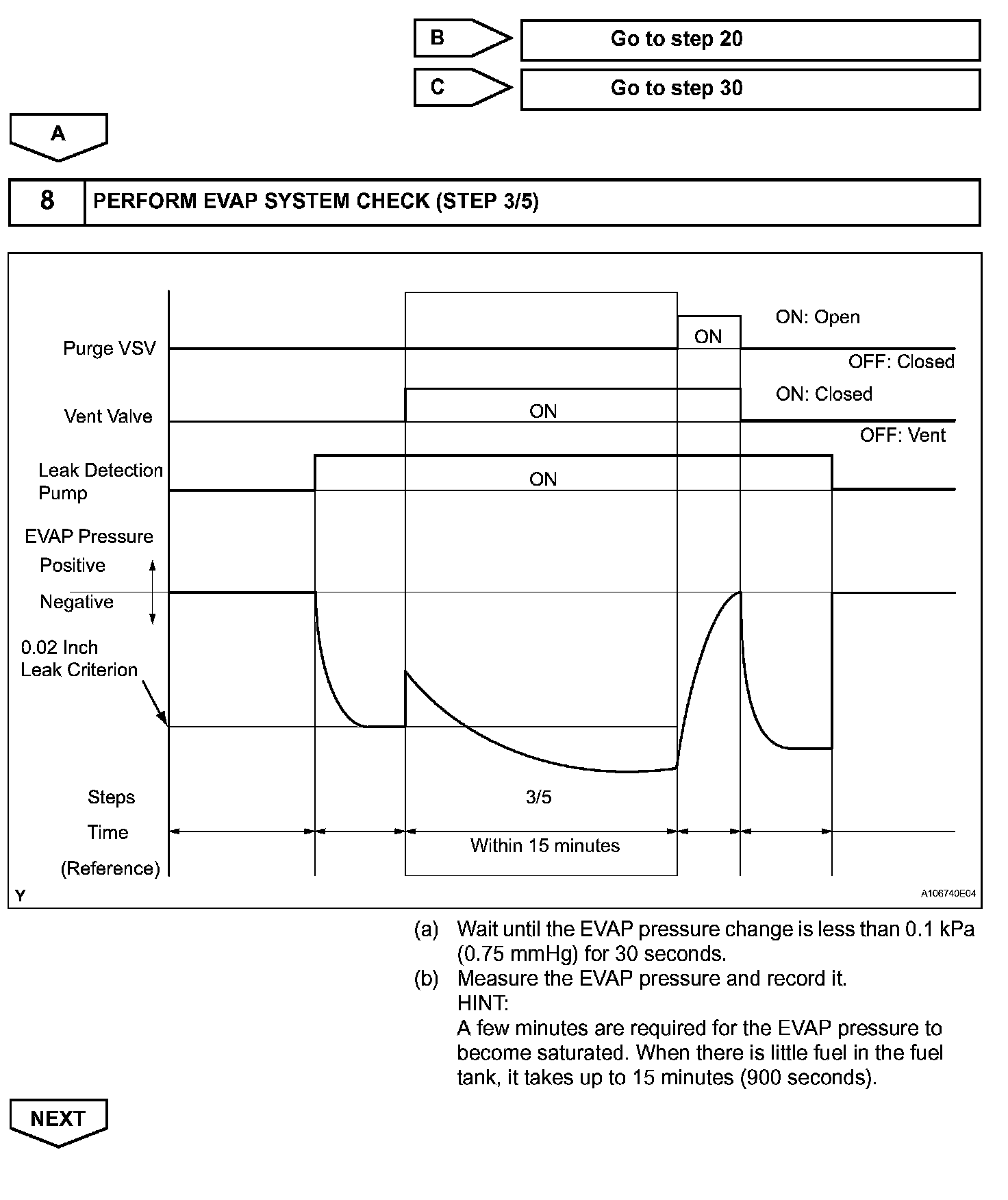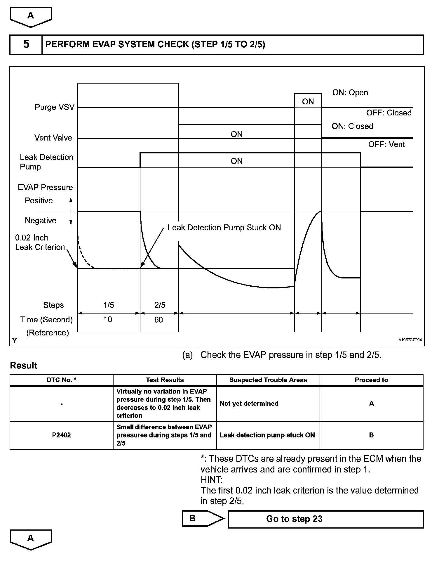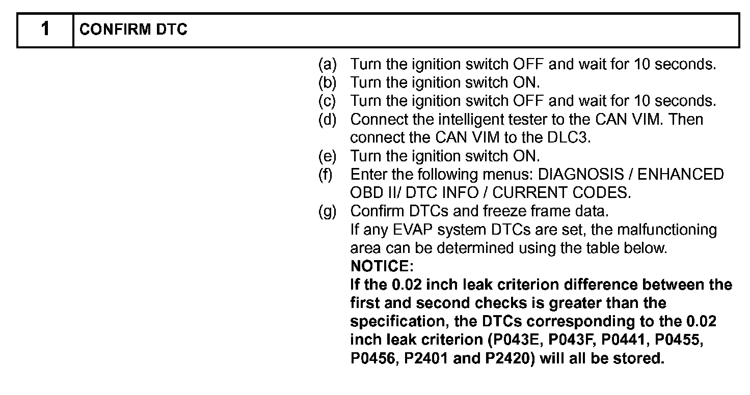 NOTE: If the 0.02 inch leak criterion difference between the first and second checks is greater than the specification, the DTCs corresponding to the 0.02 inch leak criterion (P043E, P043F, P0441, P0455, P0456, P2401 and P2420) will all be stored.