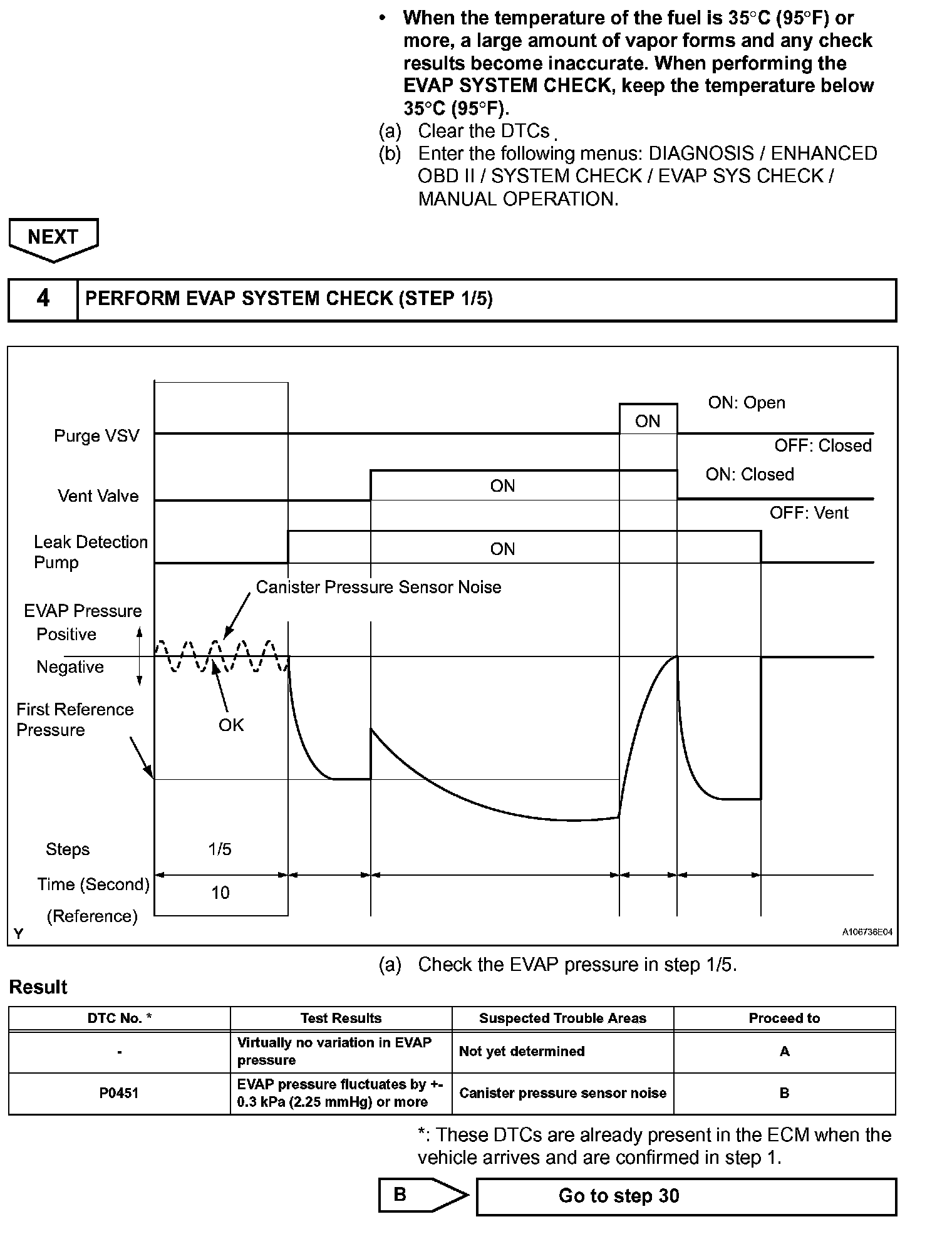Wile the engine is running and the purge Vacuum Switching Valve (VSV) is ON (open), the ECM monitors the purge flow by measuring the EVAP pressure change. If negative pressure is not created, the ECM begins the 2nd monitor.