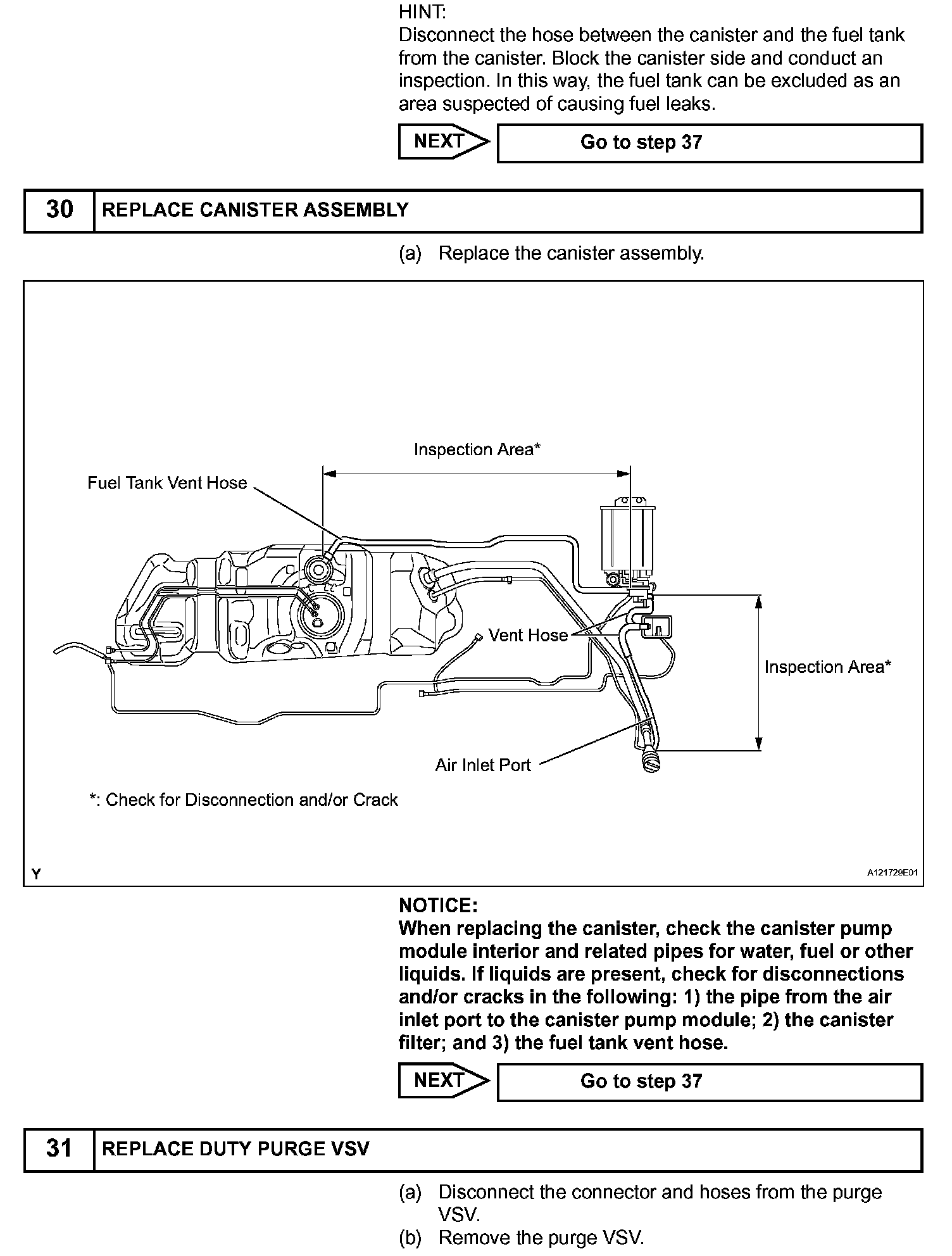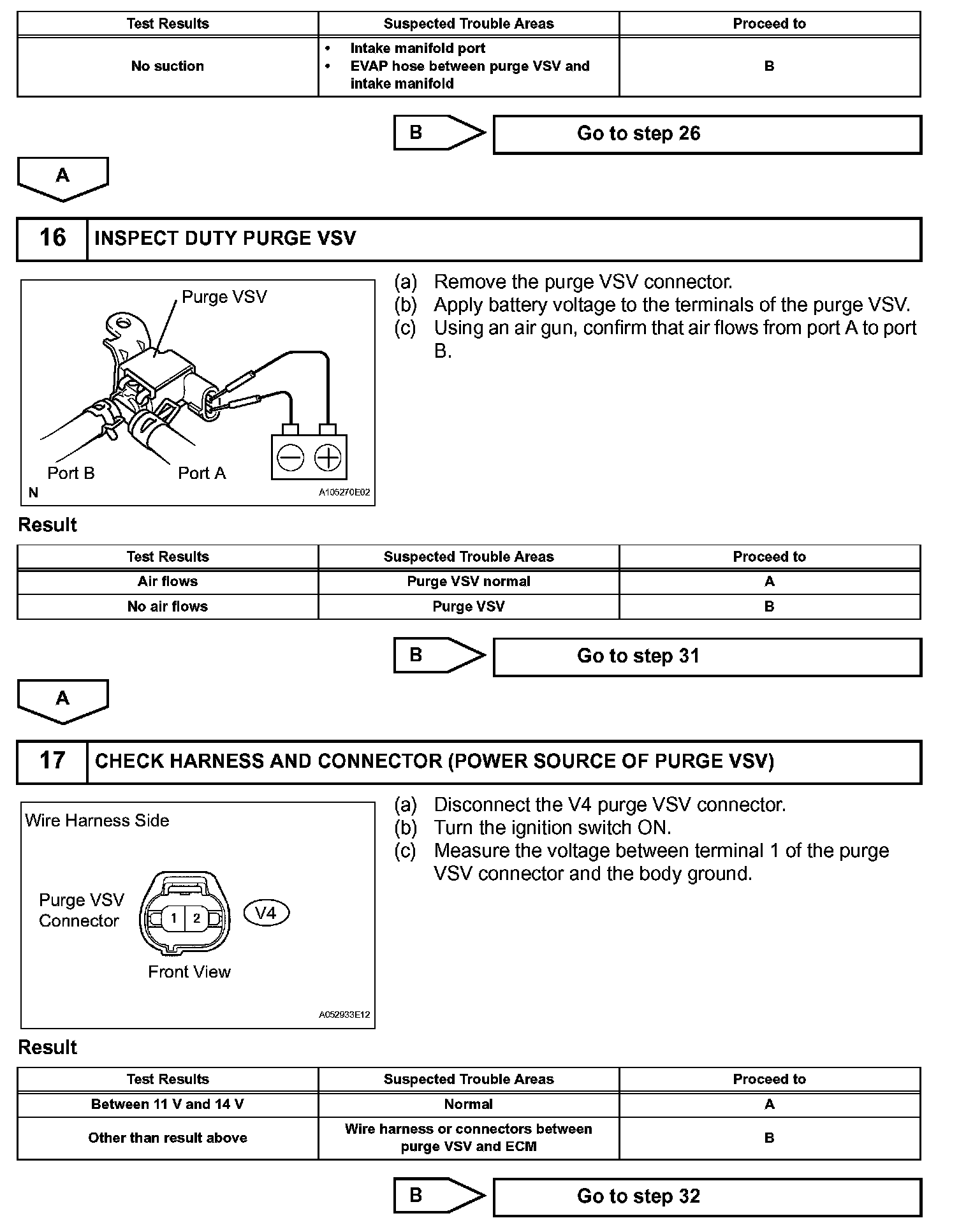 While the engine is running, if a predetermined condition (closed-loop etc.) is met, the purge VSV is opened by the ECM and stored fuel vapors in the canister are purged to the intake manifold. The ECM changes the duty cycle ratio of the purge VSV to control purge flow volume.
