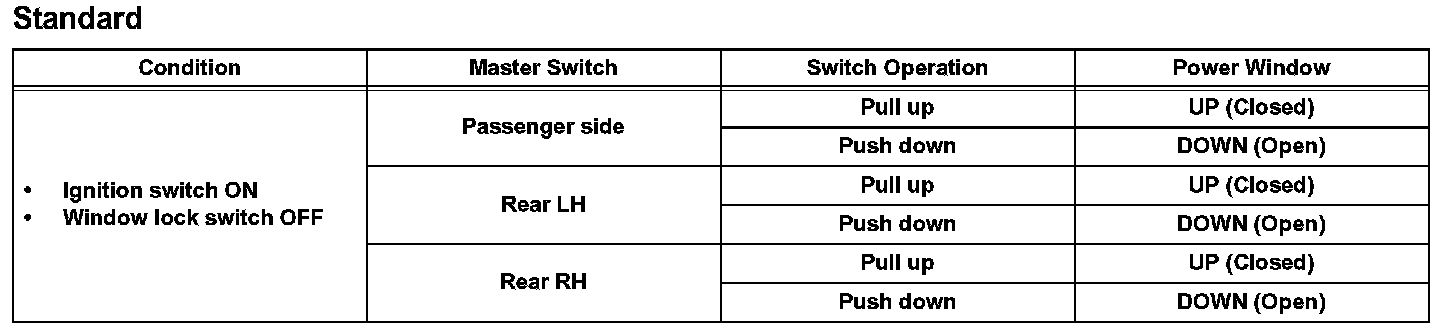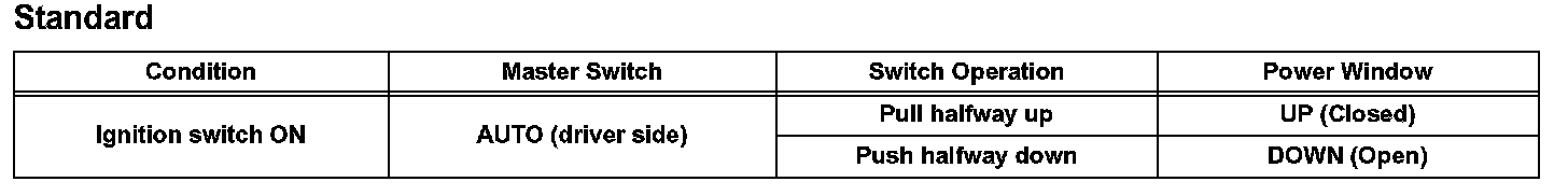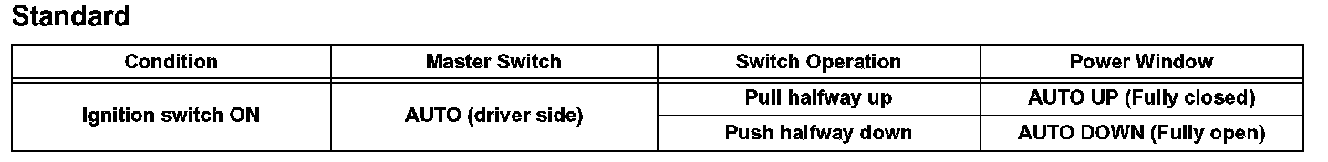 NOTE: If the power window motor has been reset, raise and lower the door glass several times using MANUAL function before performing the check.