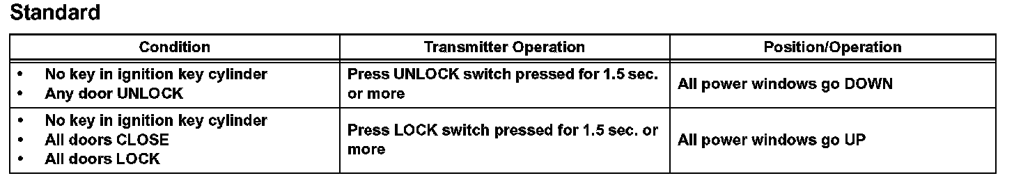 a. Check that all power windows and sliding roof (standard type only) operate as follows when operating the transmitter: