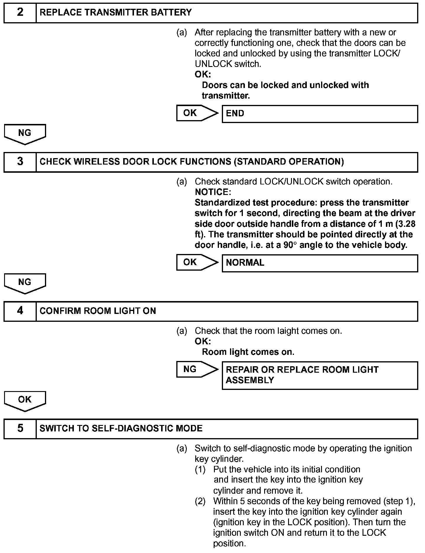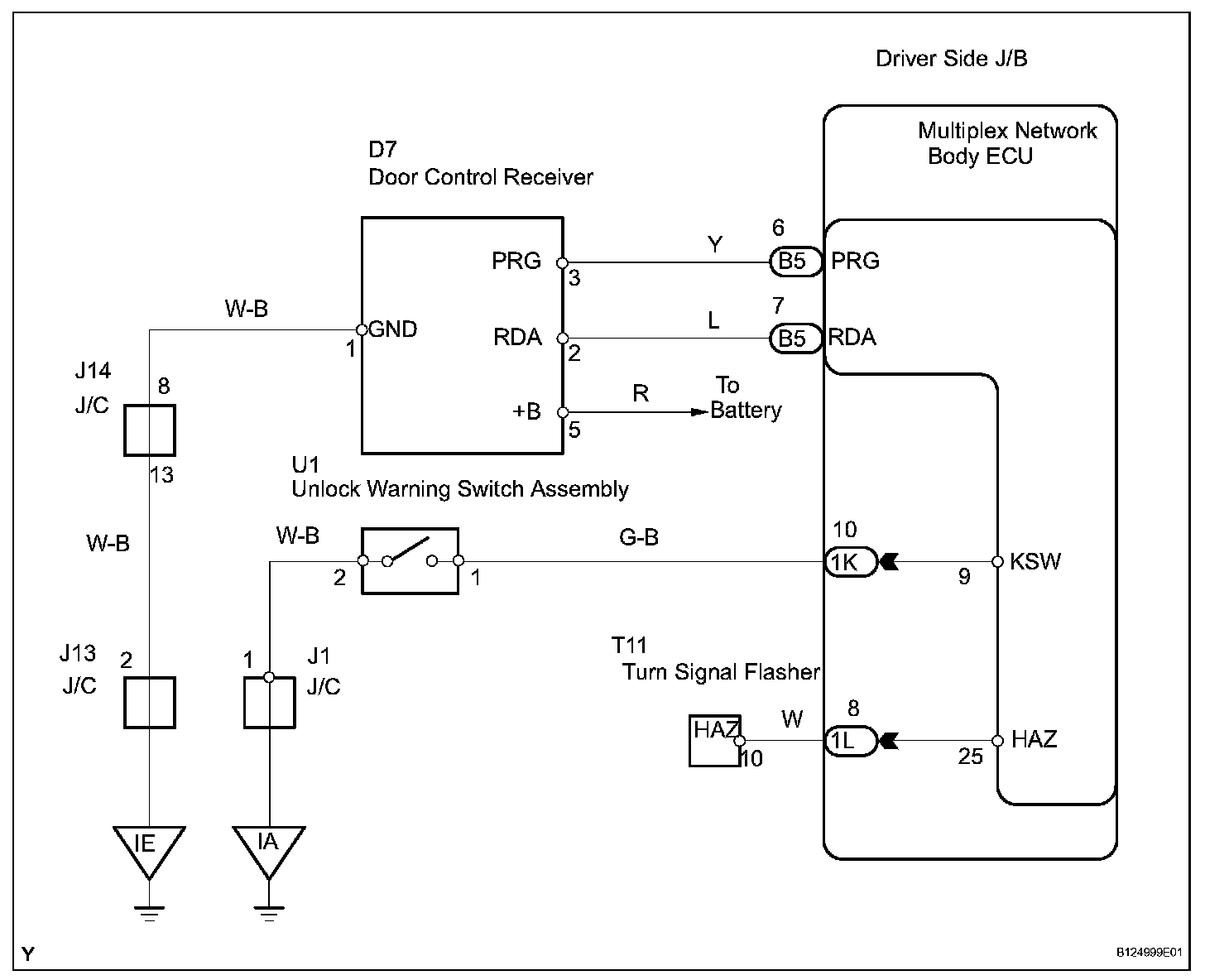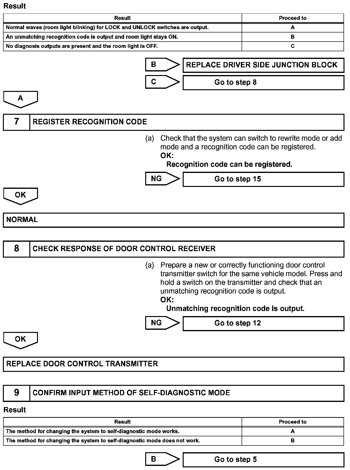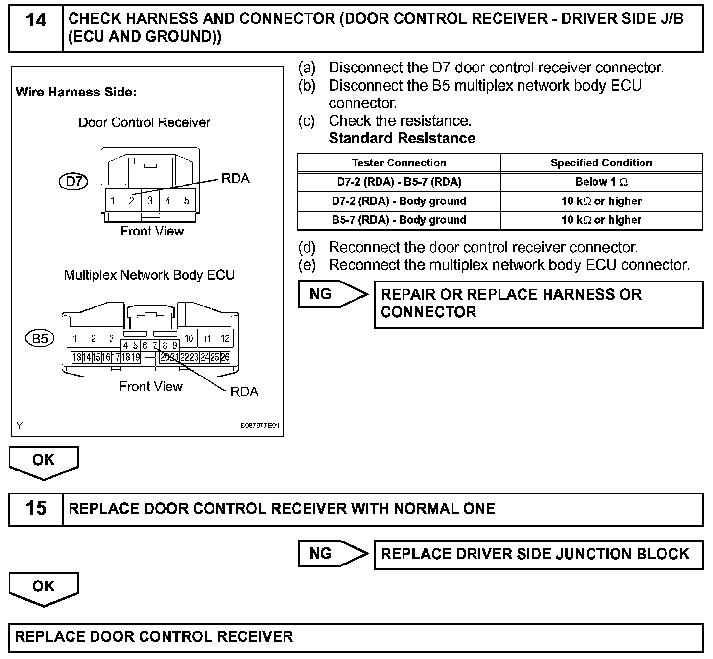 The door control receiver receives signals from the transmitter and sends these signals to the multiplex network body ECU. The multiplex network body ECU then controls the door operation by sending LOCK/ UNLOCK signals to the appropriate door lock actuator.
