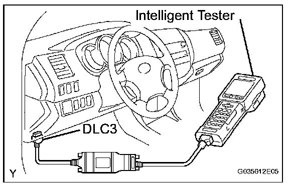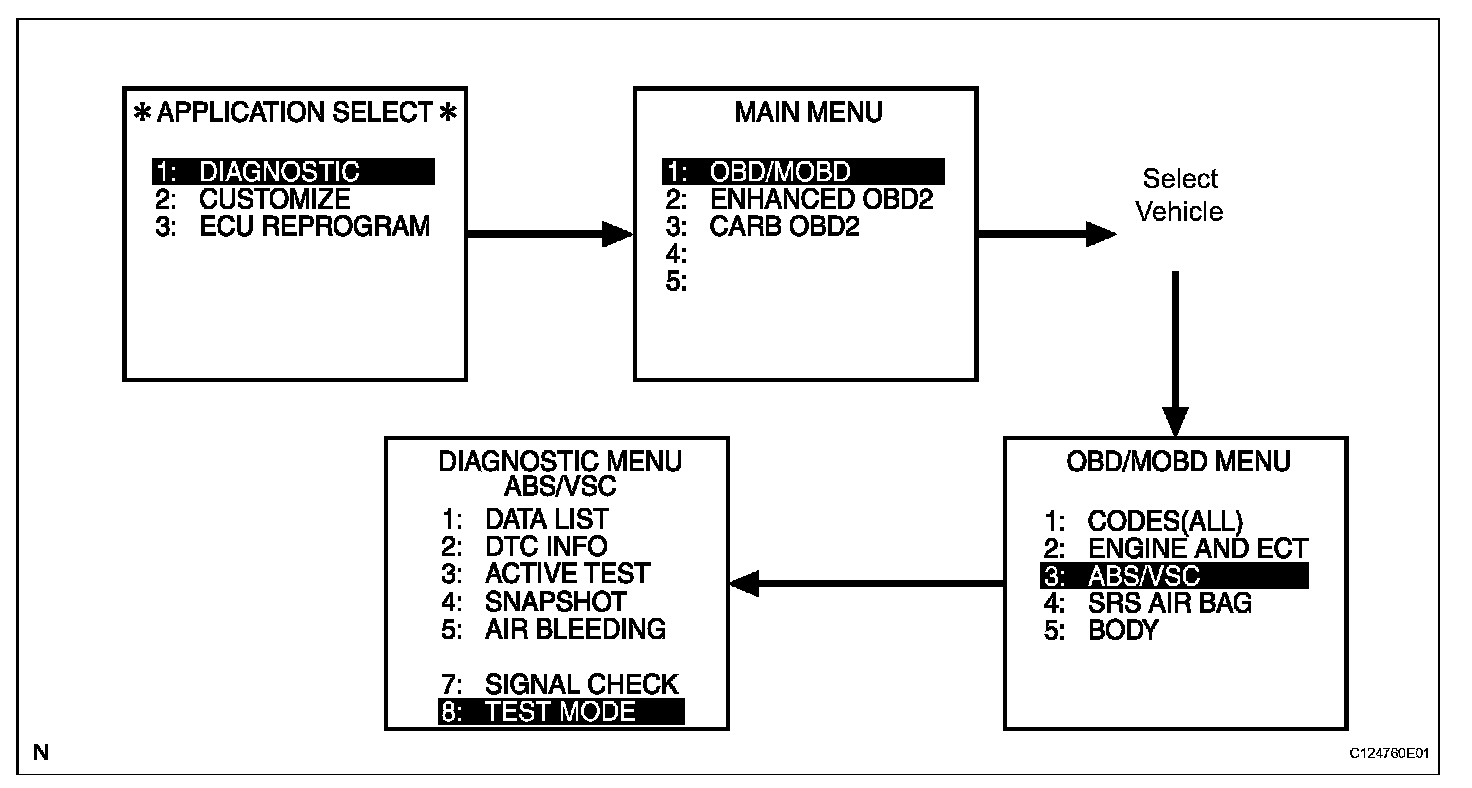 6. Switch the ECU to test mode using the intelligent tester. Select the following menu items: DIAGNOSTIC/OBD/MOBD/select vehicle/ABS/VSC/TEST MODE.