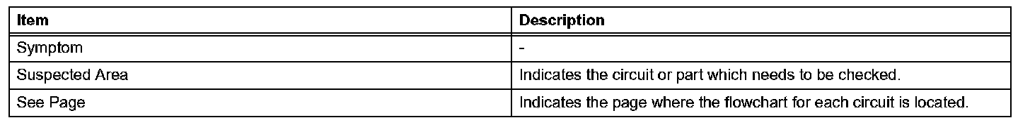 PROBLEM SYMPTOMS TABLEWhen a "Normal" code is output during a DTC check but the problem is still occurring, use the Problem Symptoms Table. The suspected areas (circuits or parts) for each problem symptom are in the table. The suspected areas are listed in order of probability. A description of each of the chart's columns is given.