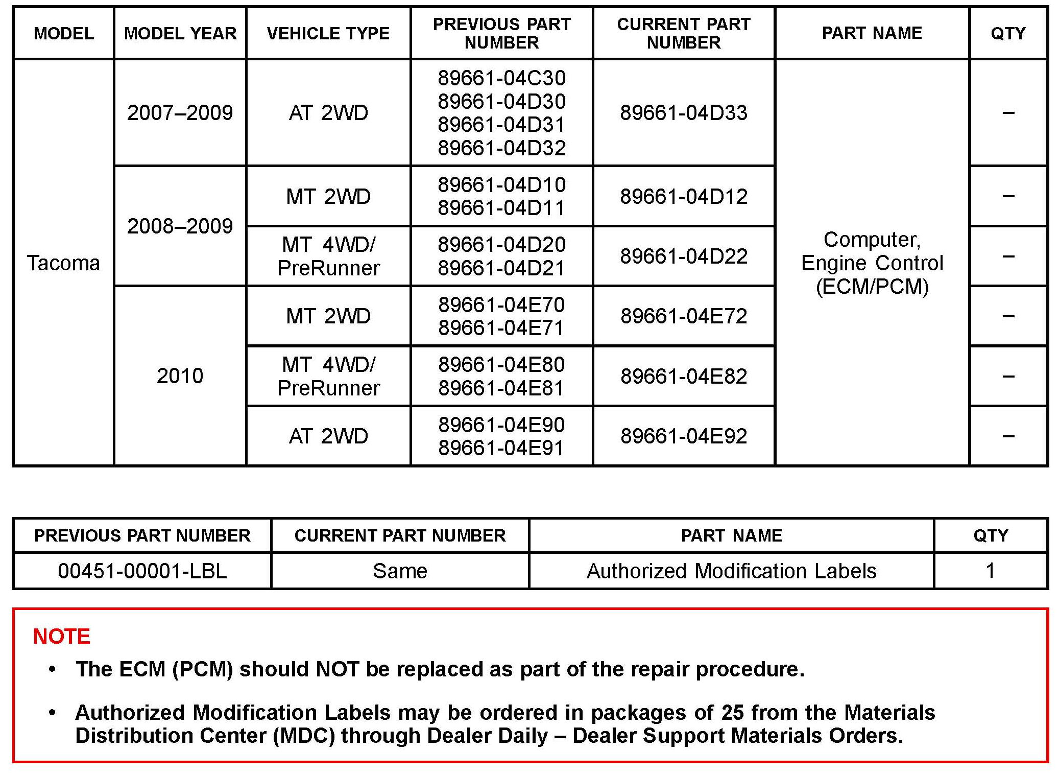 Some 2007 - 2010 model year Tacoma vehicles equipped with a block heater may exhibit a MIL "ON" condition with DTC P011B (Engine Coolant Temperature / Intake Air Temperature Correlation) after the vehicle cold soaks with block heater use. The Engine Control Module/ECM (SAE term: Powertrain Control Module/PCM) logic has been modified to address this condition.