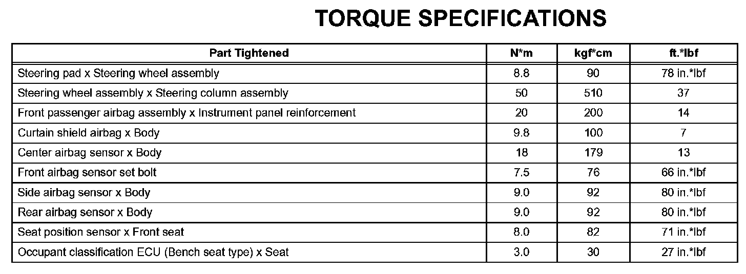 Supplemental Restraint System - Torque Specifications: