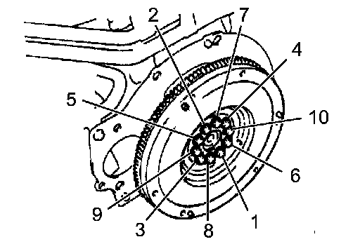 FlywheelUsing several steps, uniformly install and tighten the 10 bolts in the sequence shown in the illustration.