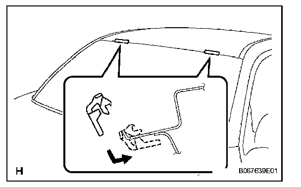 b. From the interior, insert piano wires between the vehicle body and windshield glass, as shown in the illustration.