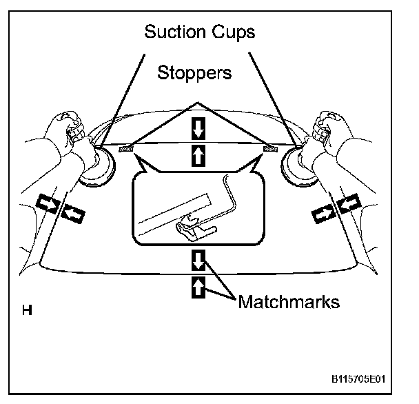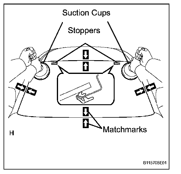 1. Using suction cups, position the windshield glass so that the matchmarks are aligned. Press it in gently along the rim