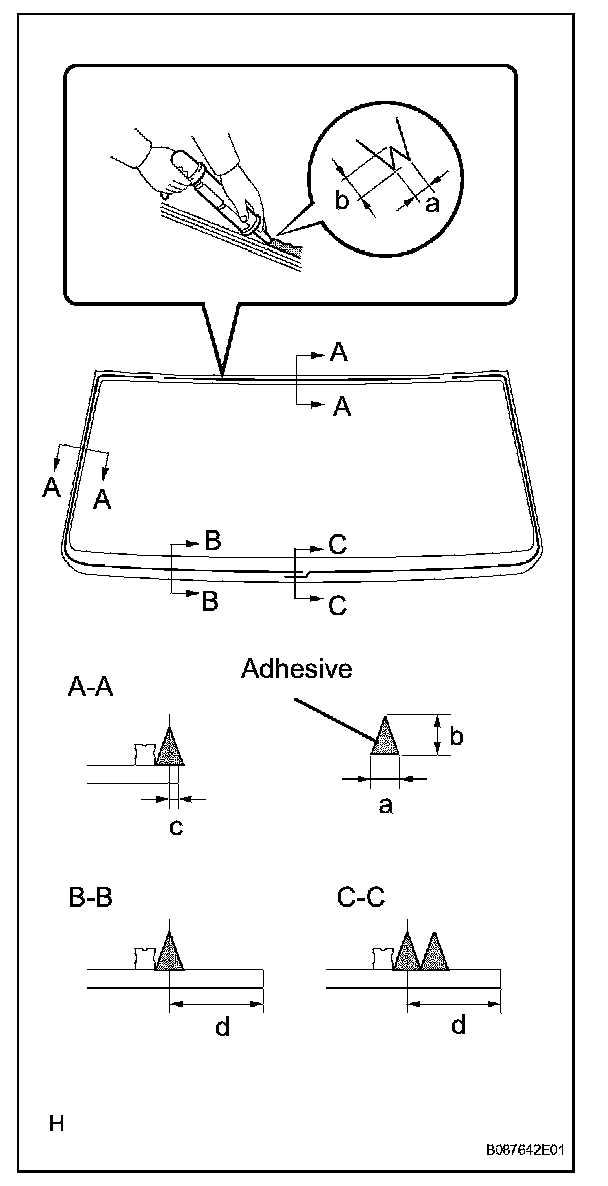 3. Apply adhesive to the windshield glass as shown in the illustration.